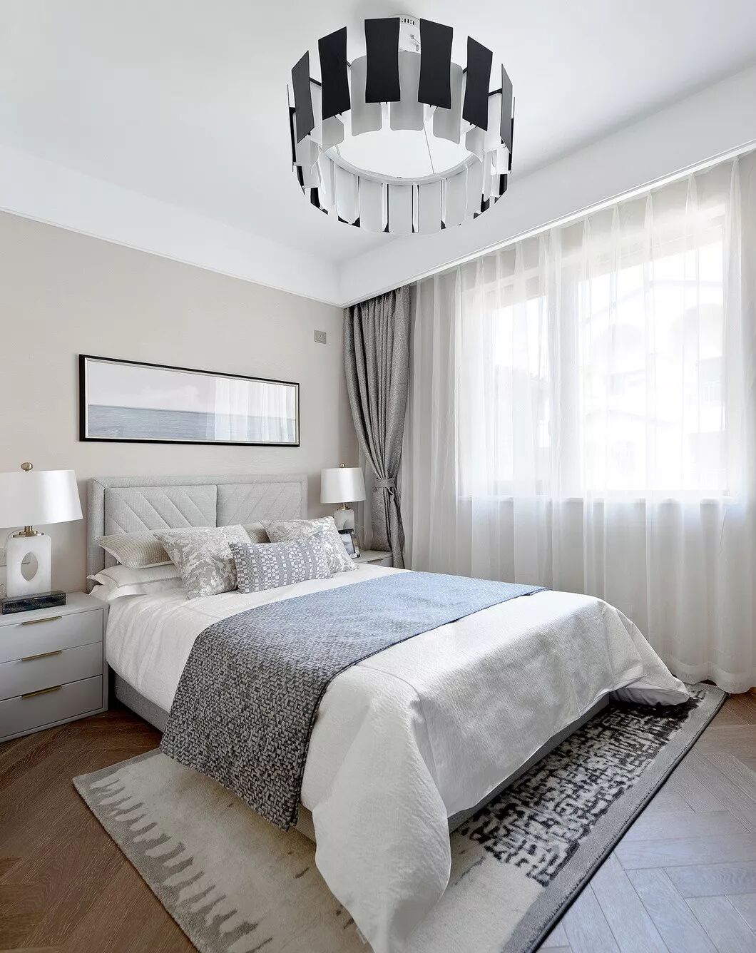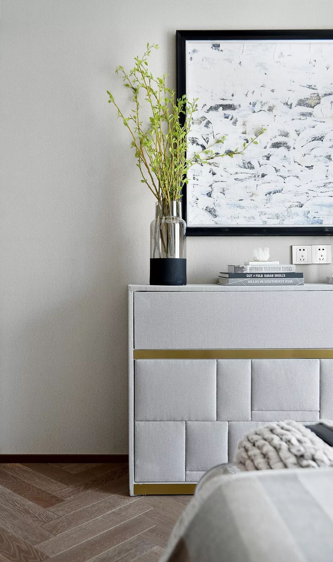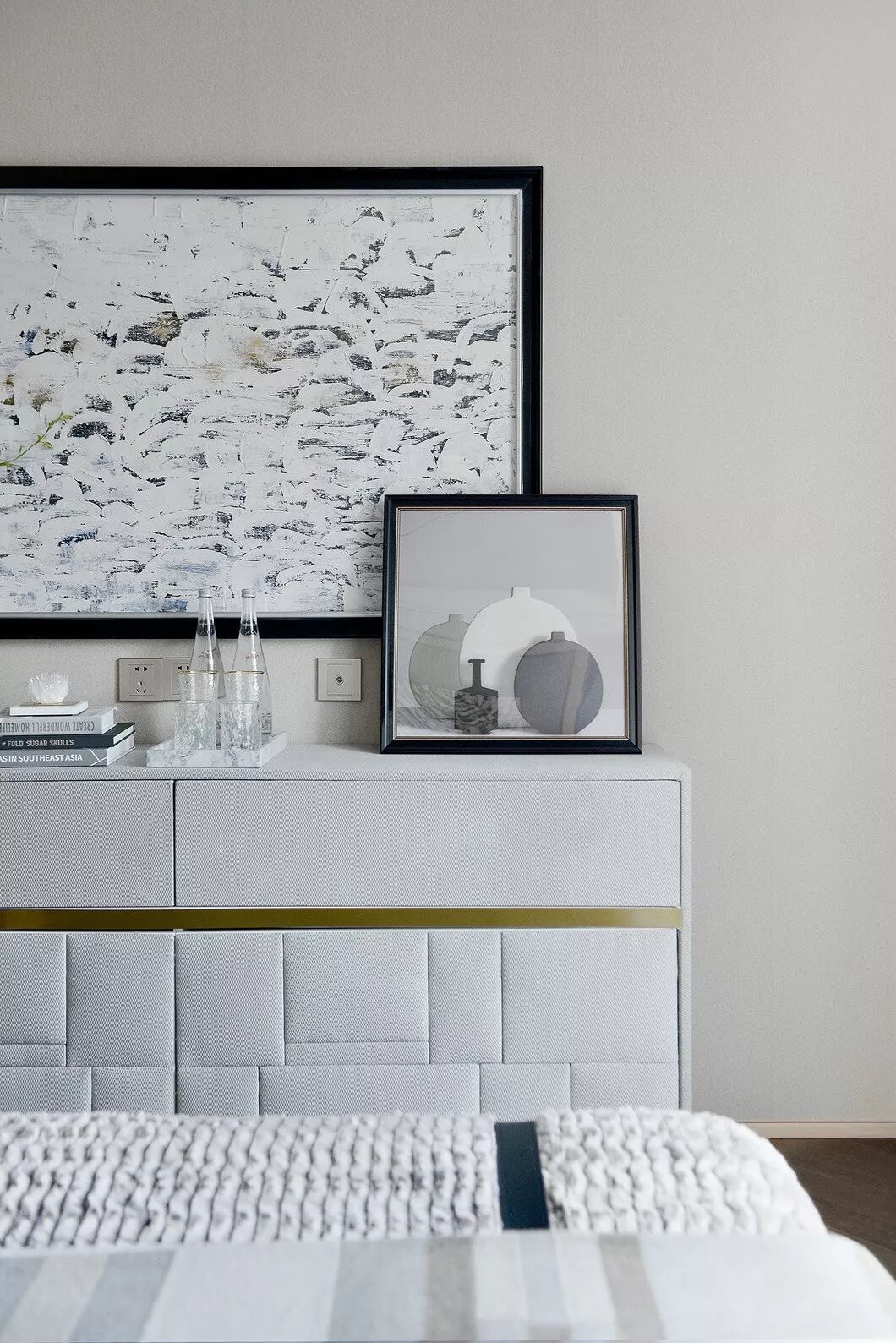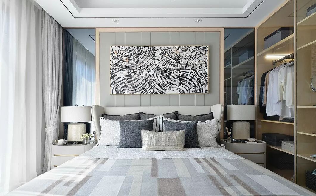 印有丰富笔触的的大幅壁画悬挂在主卧中心,为整体视觉带去了奇妙的艺术感。