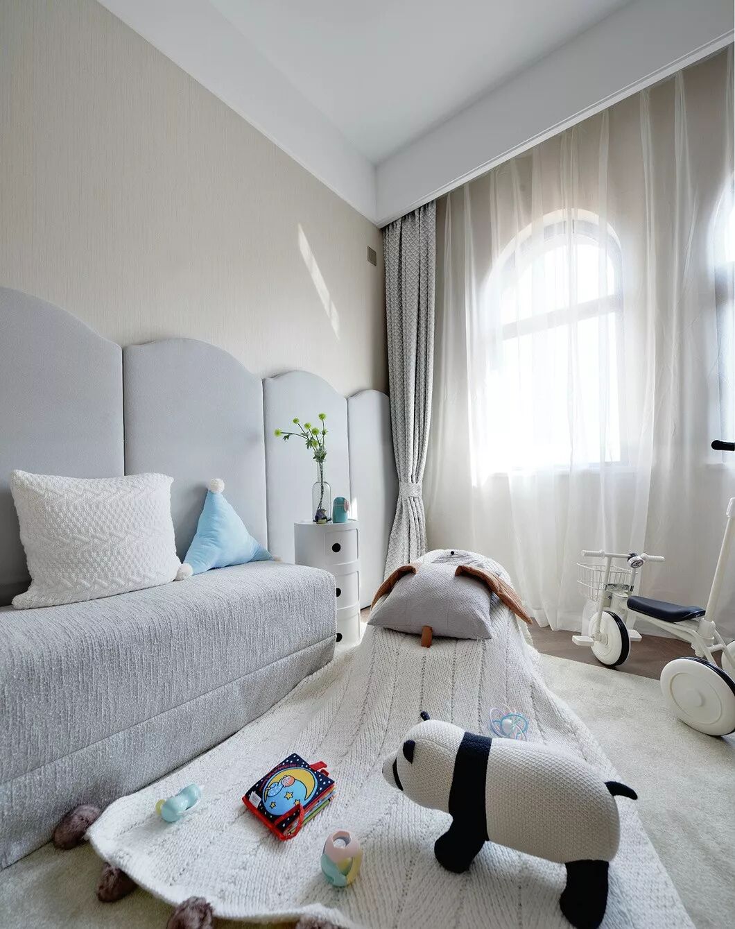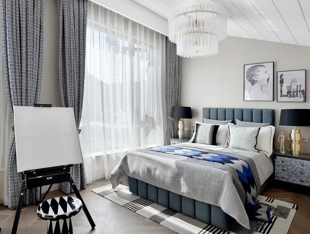 男孩房的主人翁性格活泼开朗,多才多艺。设计师将他的房间想象成艺术家在此交流、分享的“场所”,在房间里尽可能地预留更大的活动范围,并将拳击手套挂架等的形状引入了墙体设计,增加了空间的概念性。