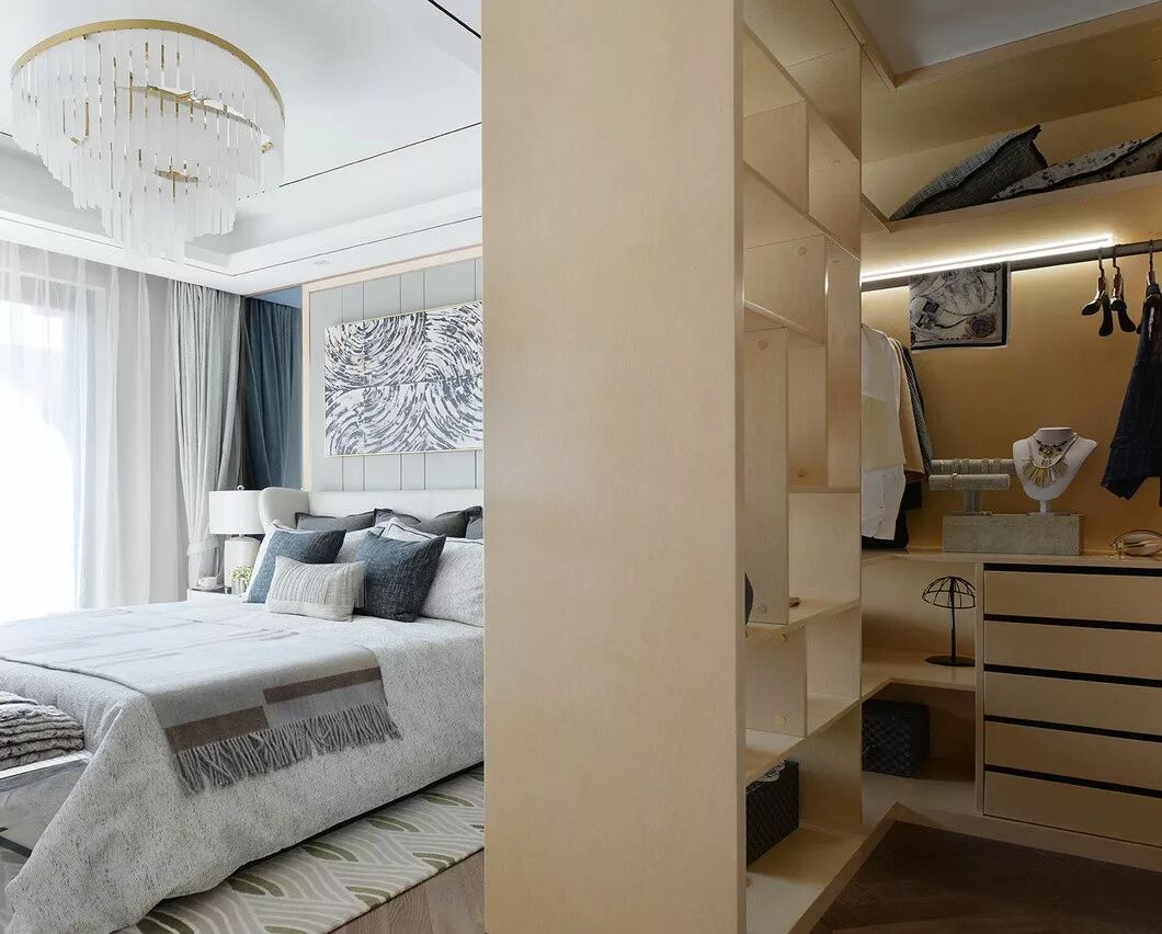 藏在隔断柜后的半封闭式衣帽间,既可以辅助卧室空间有更俐落的视觉效果,又巧妙地形成了过渡。
