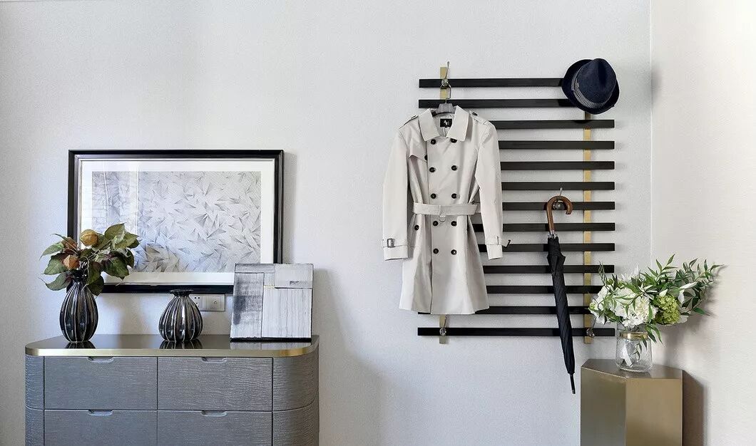 在客房,设计师不做过多柜体还可避免占用空间,从规划展示角度切入,例如运用不锈钢线条架吊挂,不仅一目了然、方便拿取,又可以表现物件的造型和美感。