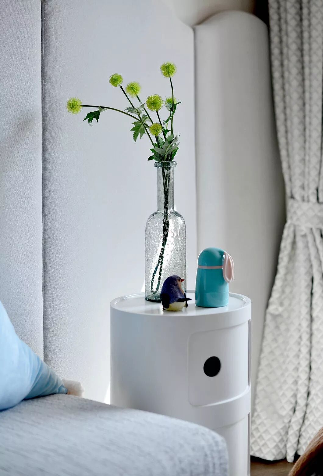 主卧柔和的整体色调受到自然光照的洗礼,搭配一束绿植,使空间充满惬意、轻松气氛,展现出有別于现代主义冷冽的温馨感。