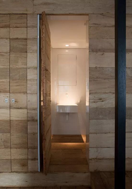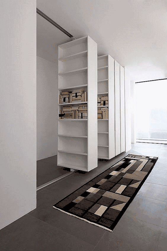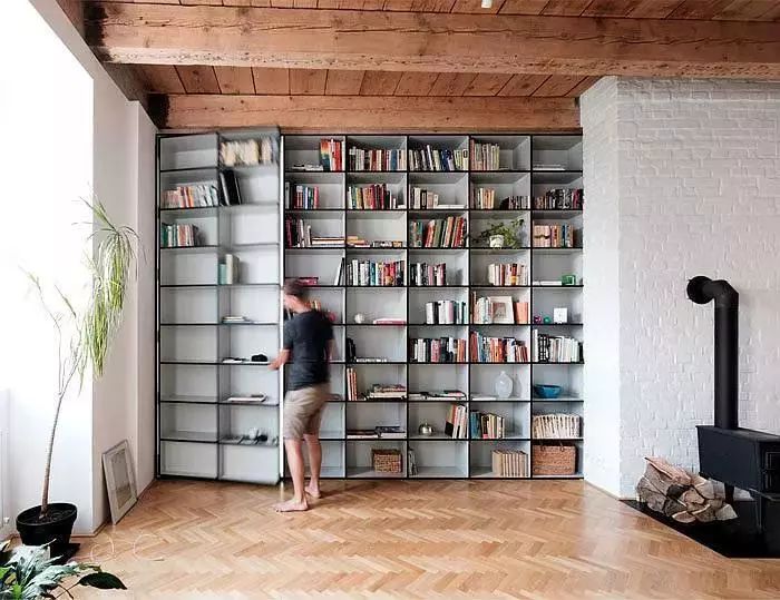 很多隐形门都出现在一大排收纳架的后面,一来用作收纳使用,二来收纳架上的纹路刚好可以为隐形门提供很好的伪装。