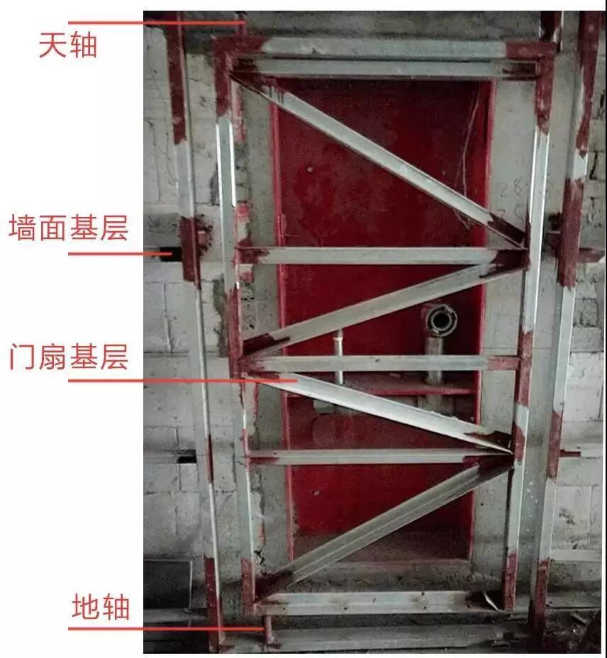 这是使用需焊接的天地轴对门扇进行开合作用。优点:承受荷载大,材料成本低,性能稳定。缺点:安装较麻烦,可开启角度小,开启不便。