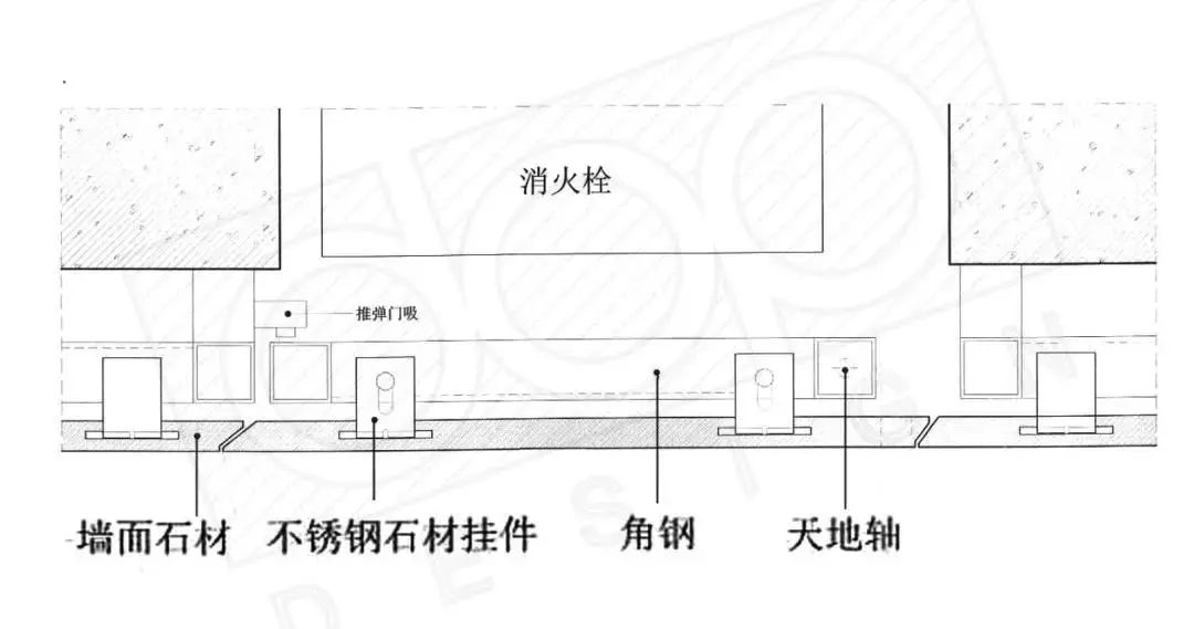 如上图所示(以石材干挂为例),它的门扇部分其实是周边墙面做法的延伸,周边材料是用什么构造做,门扇就用什么构造做。
