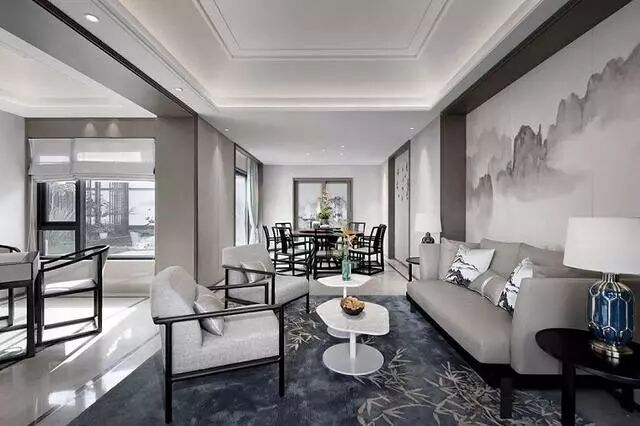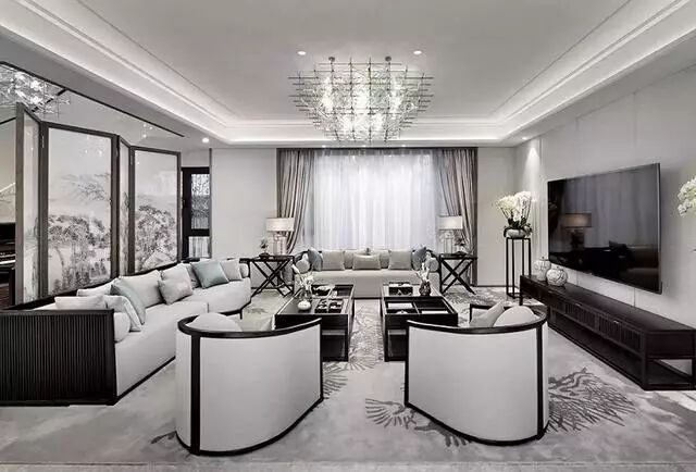 设计师对屏风的设置,是客厅的一大亮点,不仅增加了一个附属区域,将空间做了一个完美分割,还增强了空间层次感,且灰白的水墨画,将客厅的雅致美完全呈现出来。