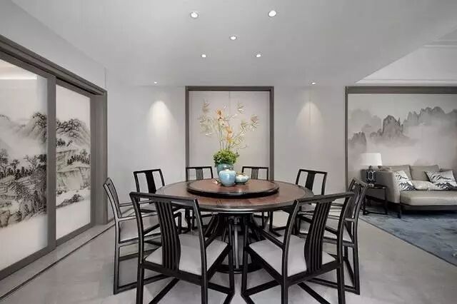 水墨推拉门的设计,一开一合之间,不仅创造出了灵动的空间组合,使空间既可融为一体,也可单独使用,还提供了餐厅进出自由方便的功效。置身于这样的空间中,仿佛隔开了外界的一切纷扰,将用餐的优雅环境完美呈现出来。