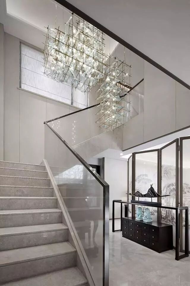 干脆、利落的楼梯黑色扶手线条,创造了一道空间视觉的动线指引,连接了楼上与楼下的空间。垂落下来的吊灯元素打破了楼梯间空间的单调与呆板,增强了空间的立体感,形成了一种独特的艺术品味,尽显雅致生活的品质。