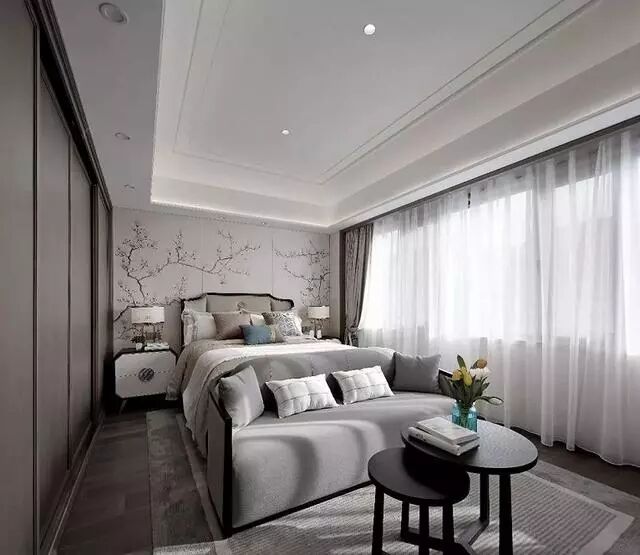 设计与生活密不可分,融合在生活的各个角落。主卧作为最私密的休息空间,环境的设计和情调的营造,极为考究。背景墙上,墨绿色的叶子衬托着白色的花朵,柔和又典雅,和地毯相映成趣。蓝白的薄纱质地窗帘和蓝白的床上用品相呼应,恬静、舒适、宜人。