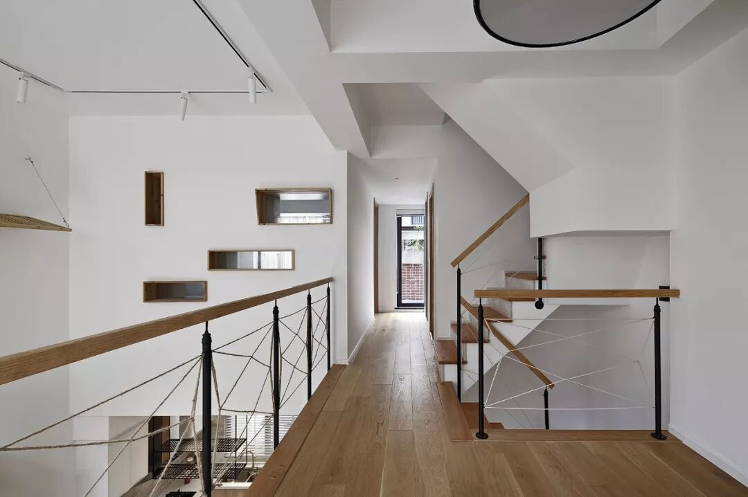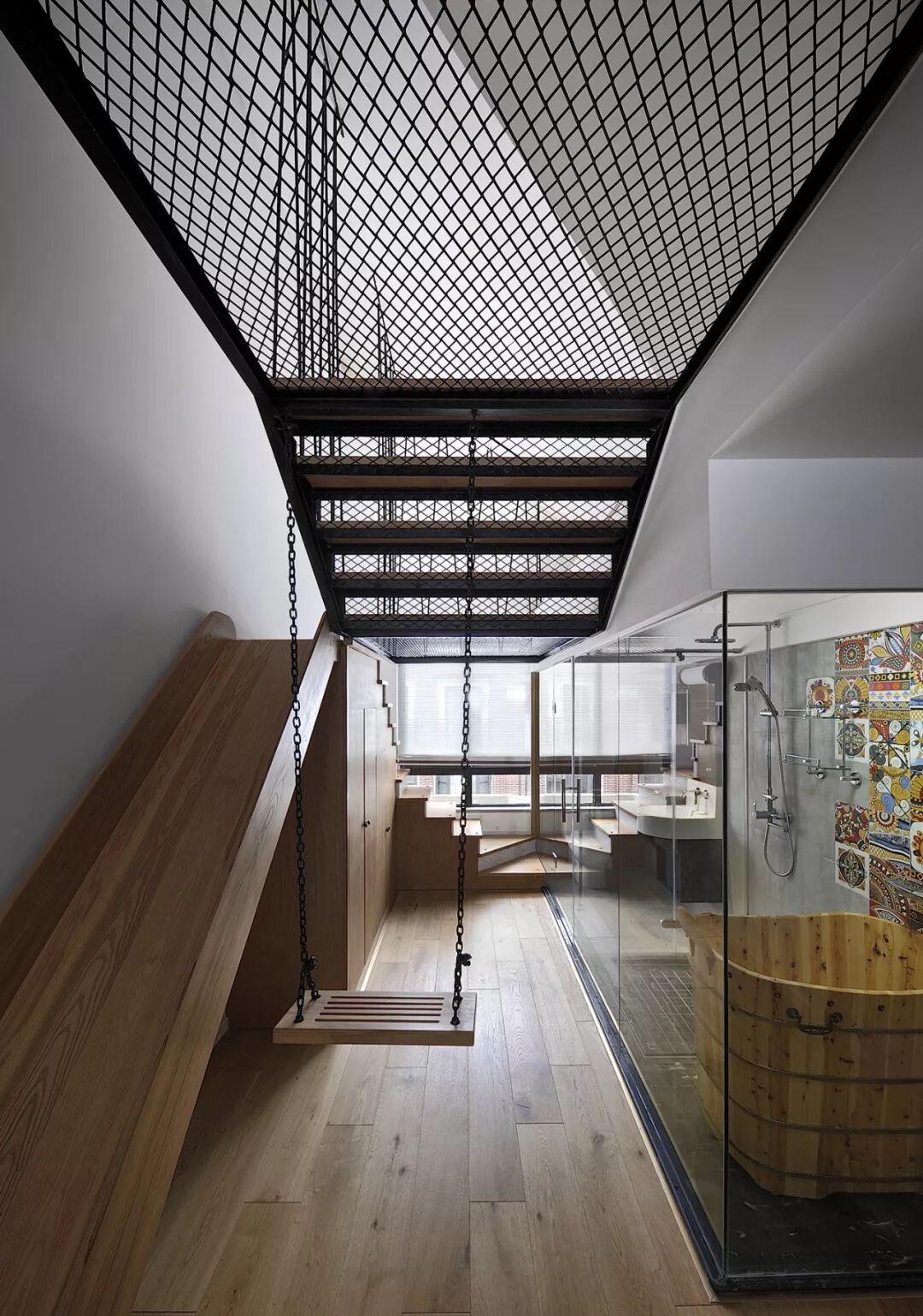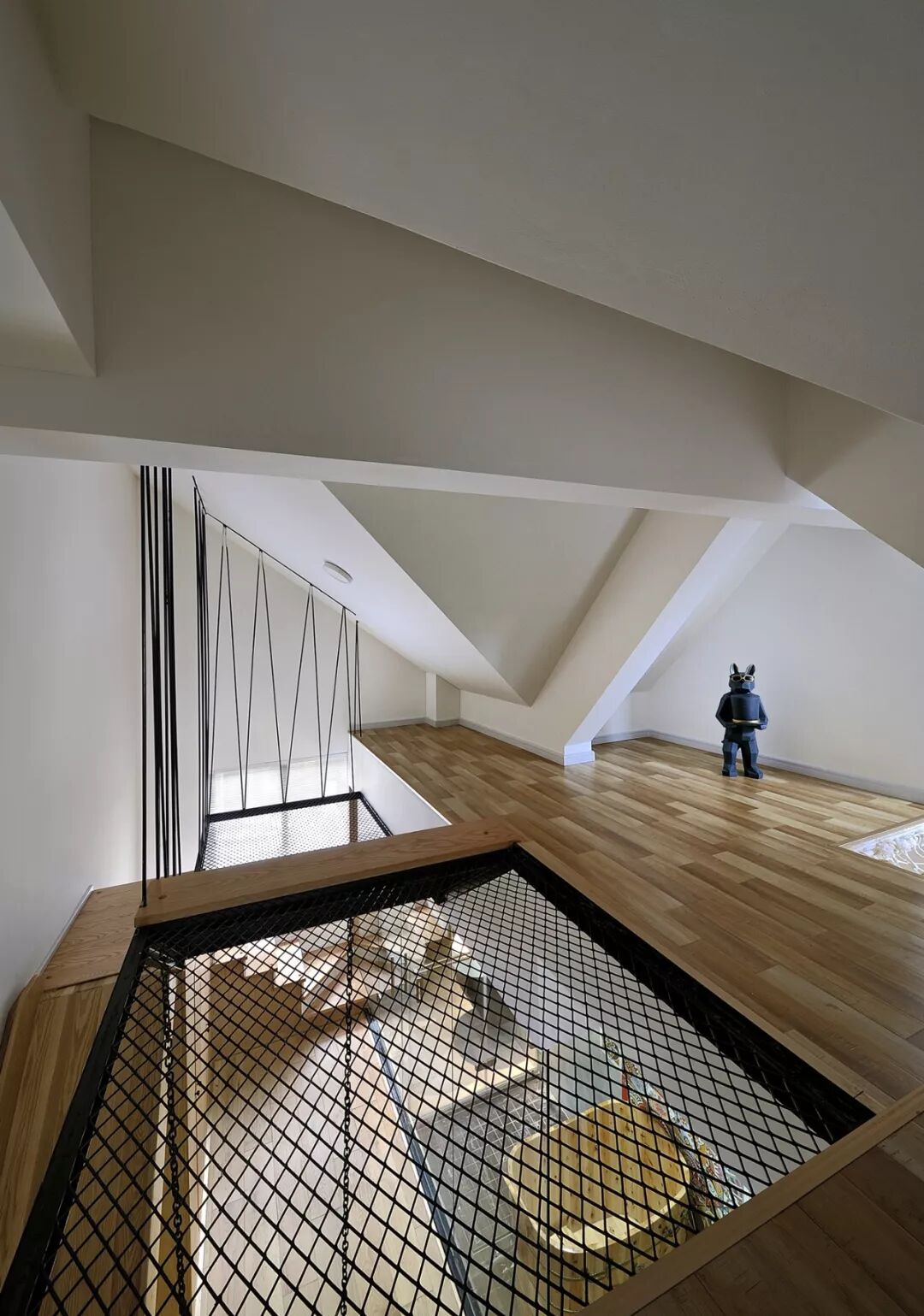 以四楼和阁楼为例,这里主要作为儿童活动的场所,但是由于阁楼只有一个老虎窗,设计师为了最大程度利用空间,没有选择按照常见的那样安装倒楼板,而是用钢结构和网格,让上下两层既分开又通透。