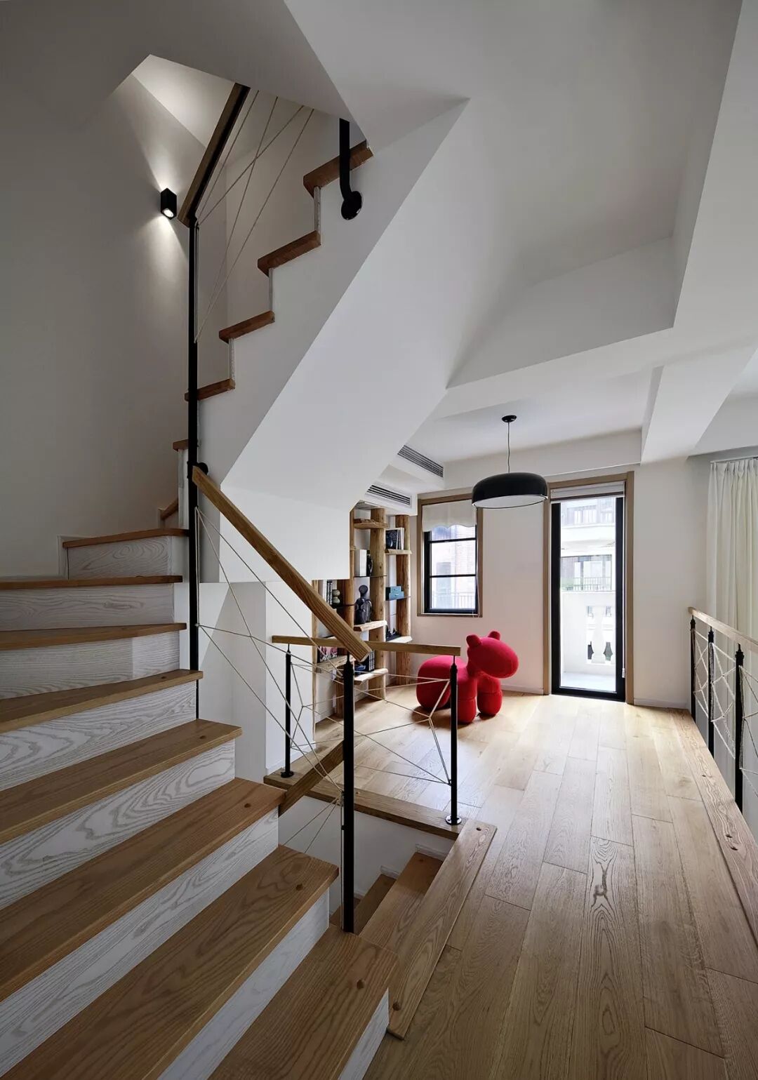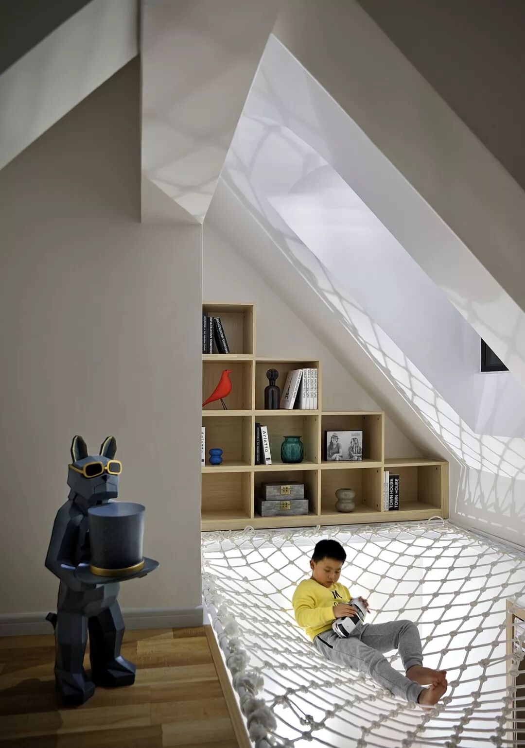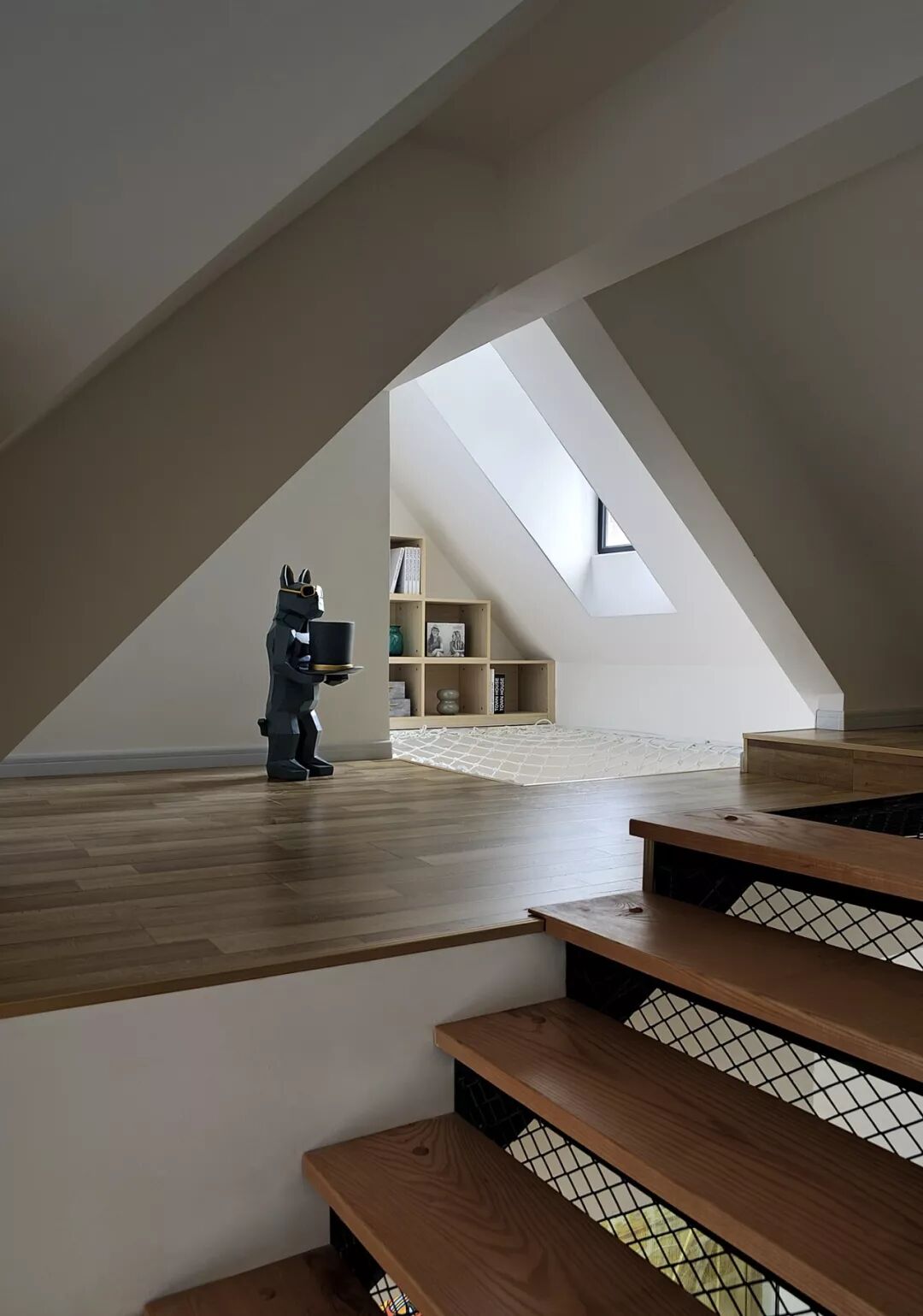 以四楼和阁楼为例,这里主要作为儿童活动的场所,但是由于阁楼只有一个老虎窗,设计师为了最大程度利用空间,没有选择按照常见的那样安装倒楼板,而是用钢结构和网格,让上下两层既分开又通透。