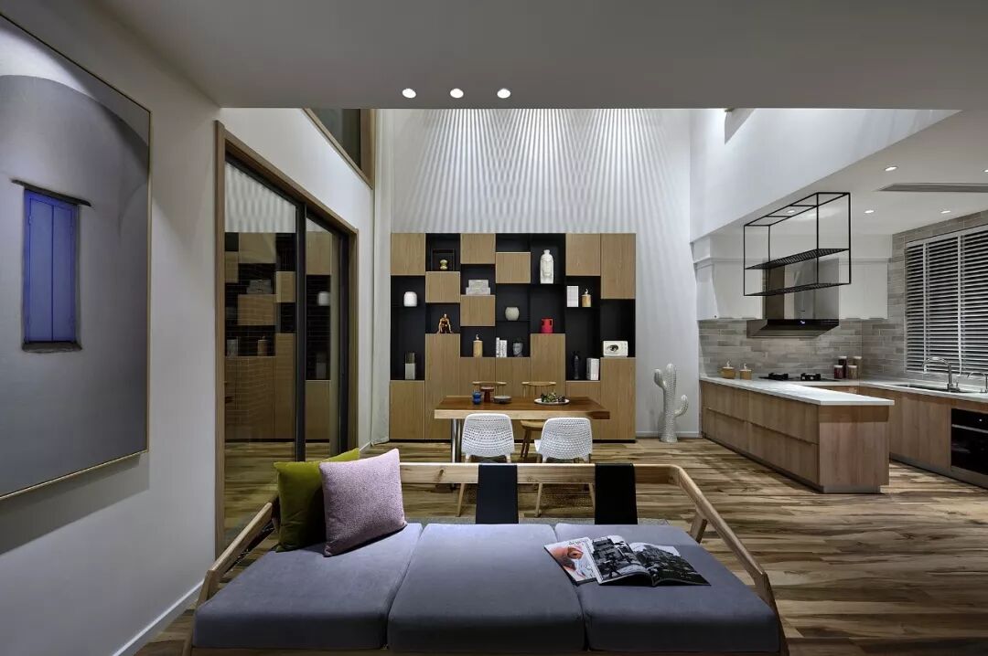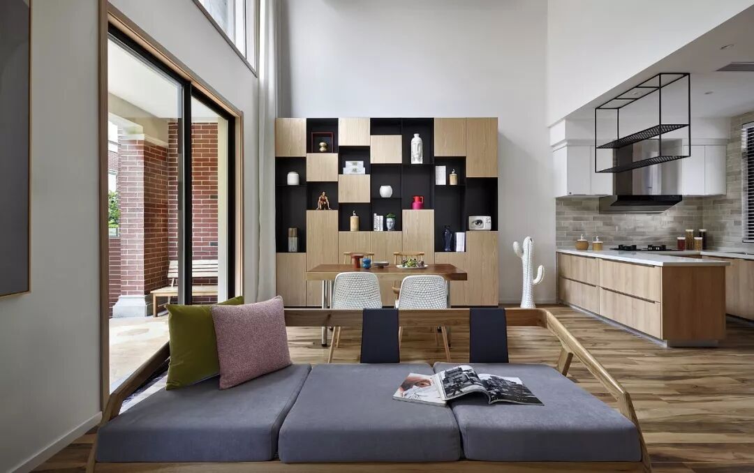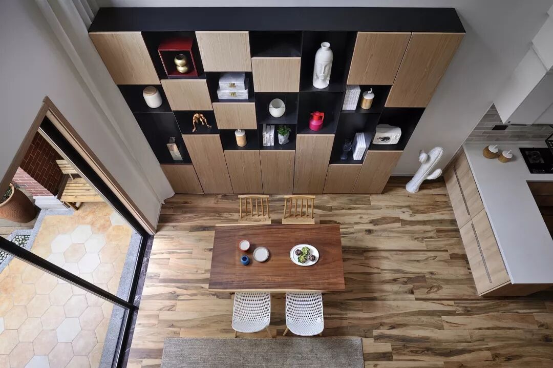 餐桌的背景墙位置设计了一大书柜,用原木色和黑色相互衬托,以矩阵方式罗列,呈现出木质特有的镂空和浮雕的艺术效果,将陈设功能和储物功能完美结合。