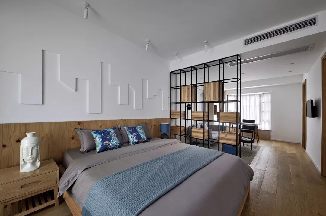 三楼以主卧为空间重点,卧室、起居空间和书房融为一体,通透感极强,令私密空间产生了开阔、舒缓的的节奏。床头背景墙以简单的几何线条勾勒城市掠影,让繁琐喧嚣的城市生活变得轻盈空灵,配合卧室柔和的灯光,营造出一个轻柔舒缓的休息空间。