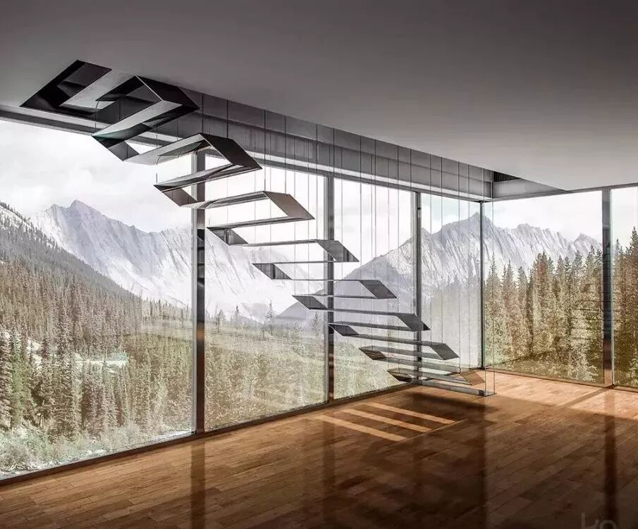 悬浮式楼梯采用金属、木质、玻璃等轻盈的材质,把整个楼梯悬在半空,让楼梯宛如一件精致的艺术品,轻盈的结构,既能节省空间,还能起到装饰作用。