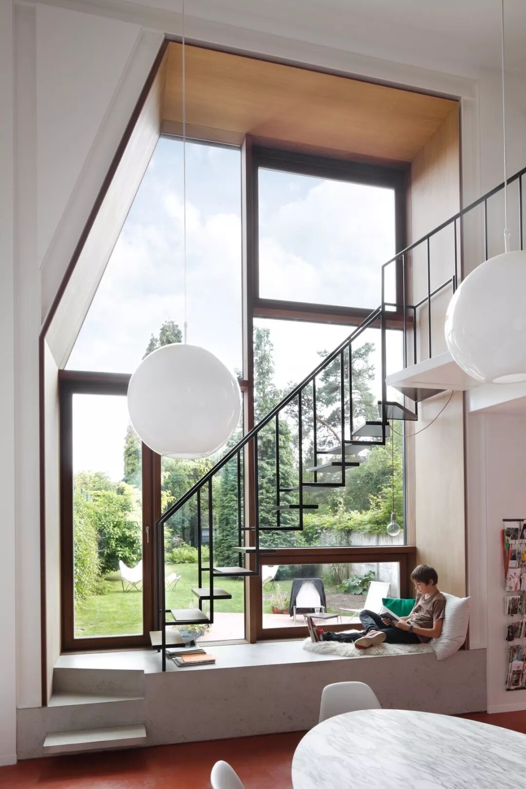 楼梯下方的空间,可以用来收纳,也可以设计为内嵌式的书桌、电视墙等功能空间。如果楼梯口靠近窗户,可以做一个漂亮的小飘窗,平时在此看看书,非常惬意。