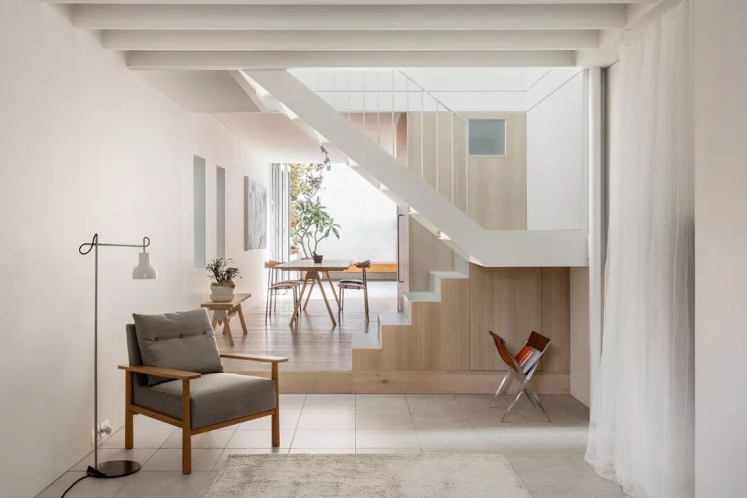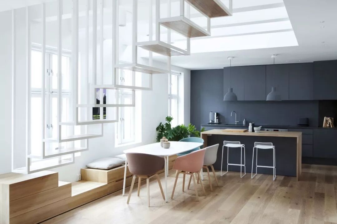 精致的悬浮式直梯,让视觉更有延伸、穿透感。而且这样可以腾出更多的室内空间,同时还能起到“隐行”分割居室的功能。