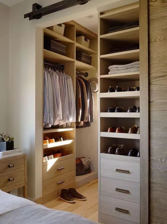 对于小户型和卧室面积有限的童鞋来说,入墙式衣柜在空间利用率上就是一把好手了,利用一面或者两面墙,轻轻松松架构起来,和墙融为一体,颜值也是杠杠的~