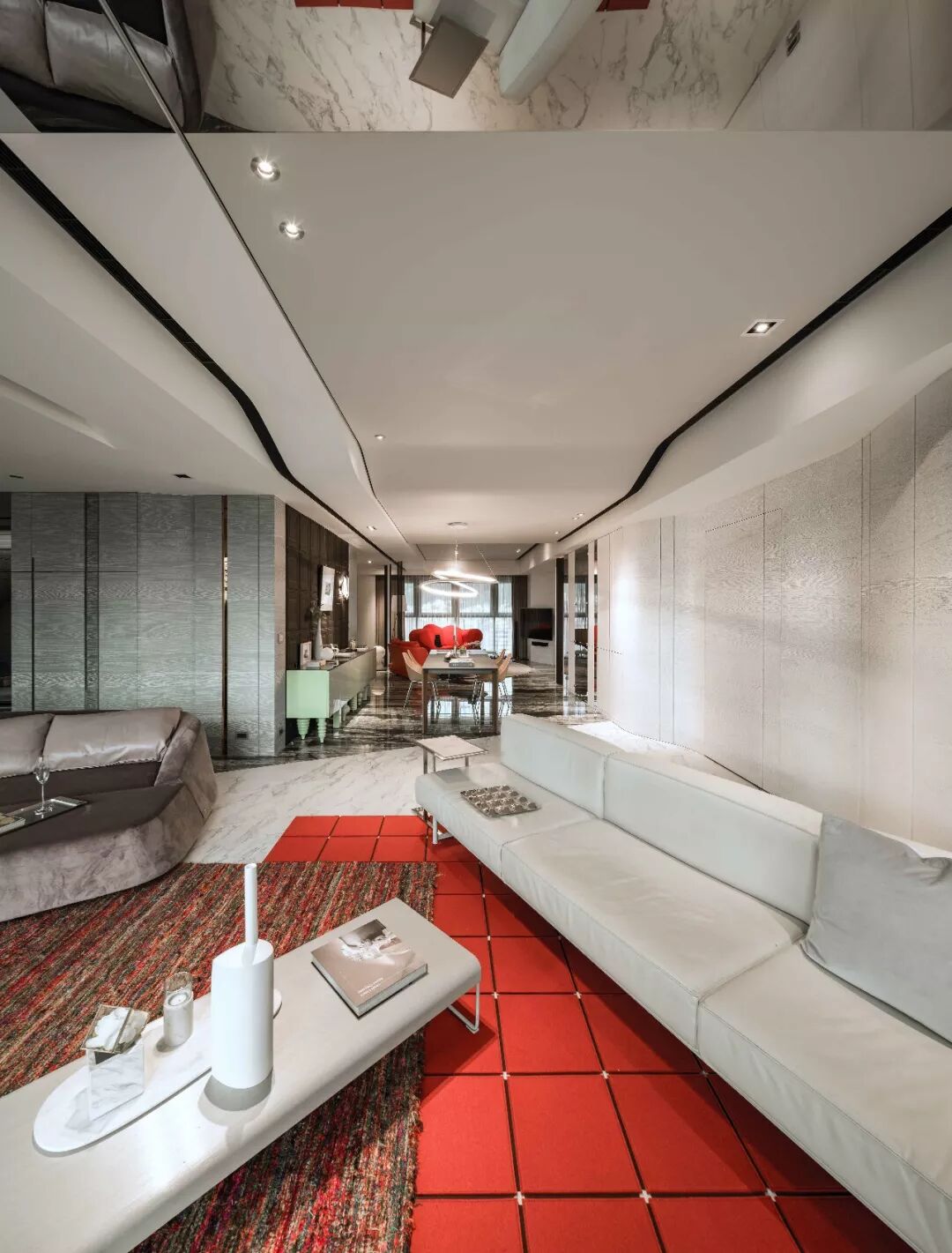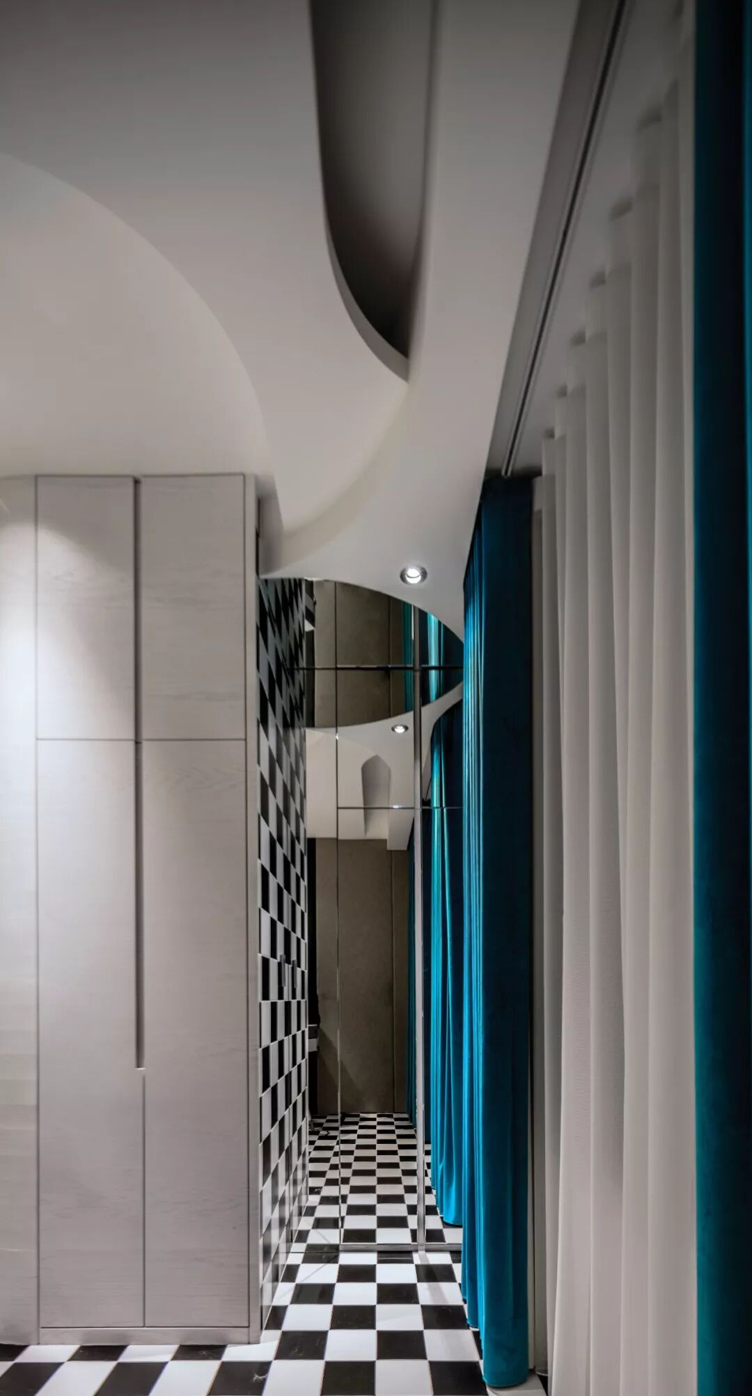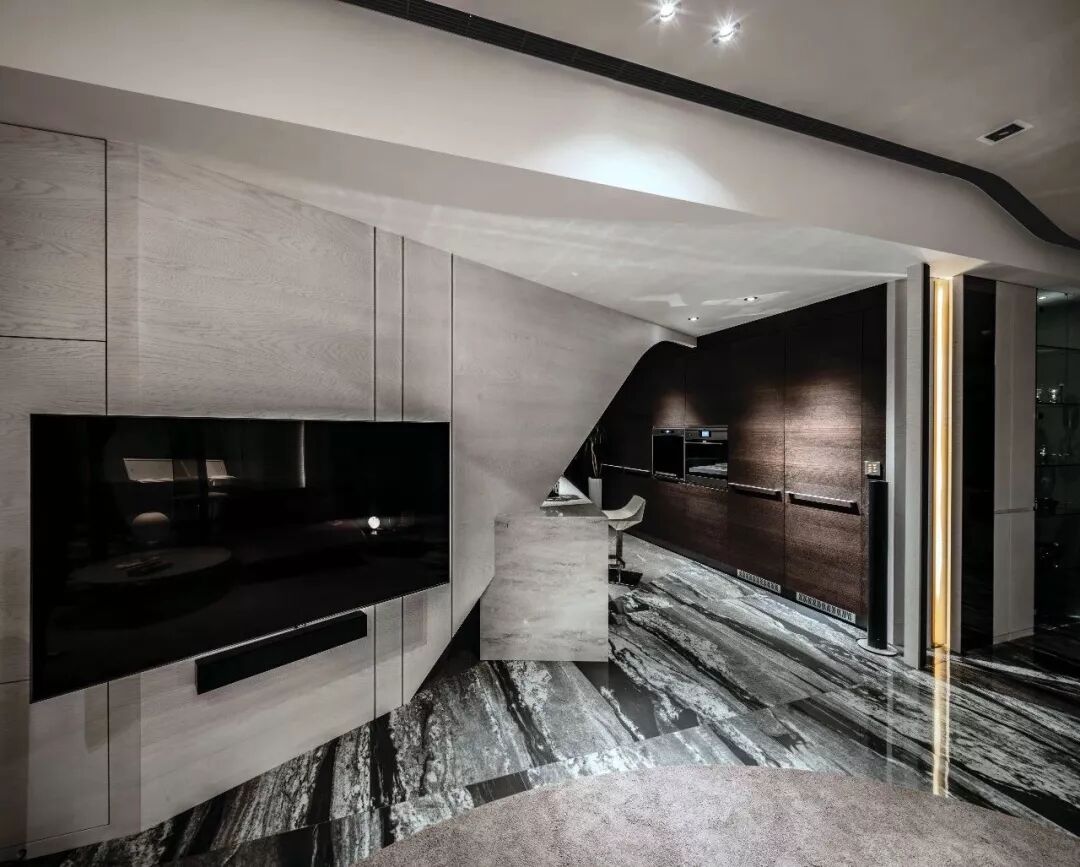 采用无限交迭的手法去延续空间,天花板的弧线用一层一层波浪推展空间,墙面则是弧形线条细腻地将收纳隐藏在里面。
