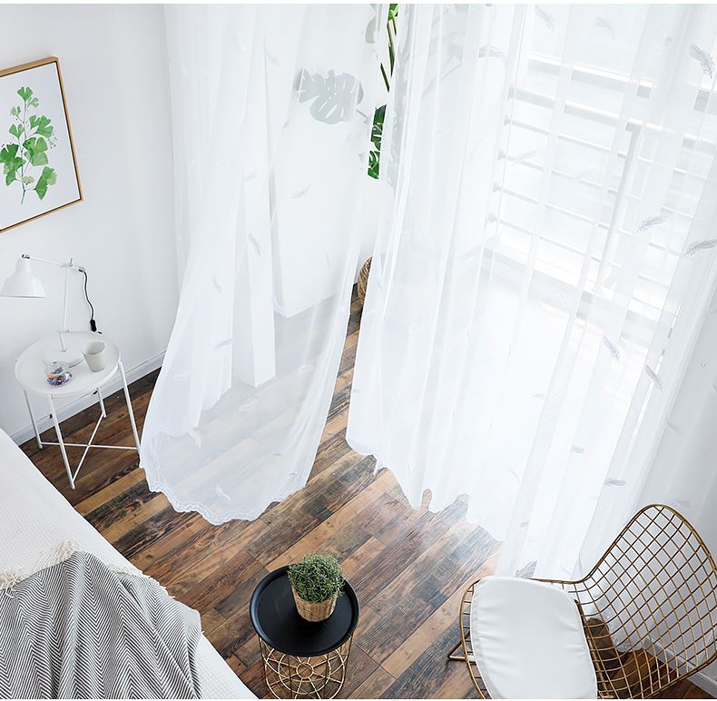 直男或许永远无法理解精致girl为什么要在卧室装上这透明不遮光的窗帘。蓝绿色搭配米色组成的小羽毛,织染在纯色的纱帘上,显得格外清新自然;羽毛白沙,温馨浪漫,朦胧飘逸;干净温柔的颜色,装饰你温馨自然的家居生活。搭配落地窗显得大气简约,竖条纹有一定的拉伸效果;搭配腰窗或者飘窗使用,植绒细节精致温馨,提升细节美感。