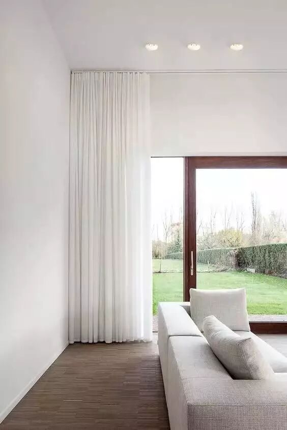 重要的事情再重复一遍:窗帘别装半吊子,顶天立地才大气!也就是让窗帘上至墙顶,下至地面,不用留出窗框到墙面顶端那一截距离。