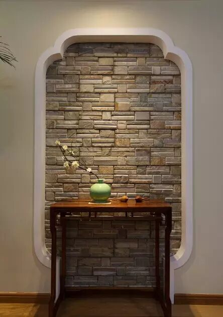 入户即可见左客厅和右餐厅,为了保持最大限度的采光、通风以及视觉空间,并没有刻意的设置玄关,而是用一面中式造型、内饰文化砖的端景来取代。 配合一个恰到好处的中式条几、青瓷瓶中盛开的腊梅、沉稳内敛的文化石,无形中吸引着你的视线。