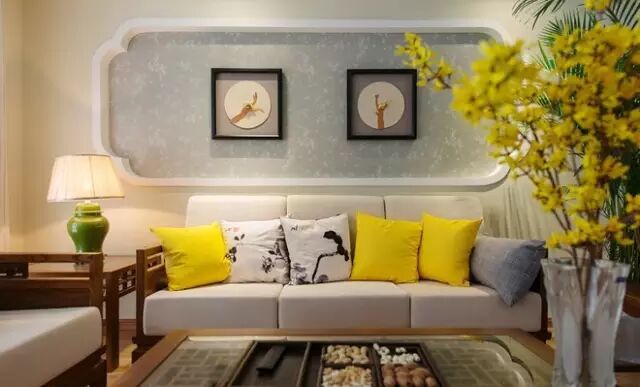 设计师在沙发背景有序的重复了端景的造型,梅花点状的壁纸和小鸟装饰从色彩和主题上都呼应了电视背景。