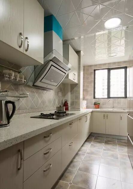 厨房利用了原北阳台的空间,采用了偏中式的仿古砖和腰线。搭配橡木色橱柜,使原本狭长的空间在视觉上有所拓宽。在另一侧设置了靠墙吧台,即可准备菜肴也可进行简单的就餐。
