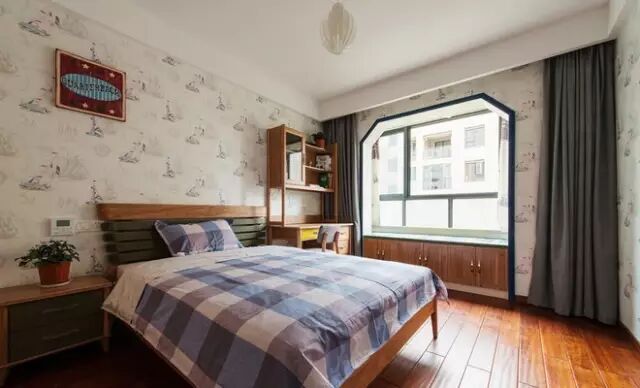 “童年的纯真、少年的七彩”。在本案的男孩房中设计师充分的运用了“七彩”的概念,用“青、蓝、黄”三色营造一个动感、朝气的室内空间。