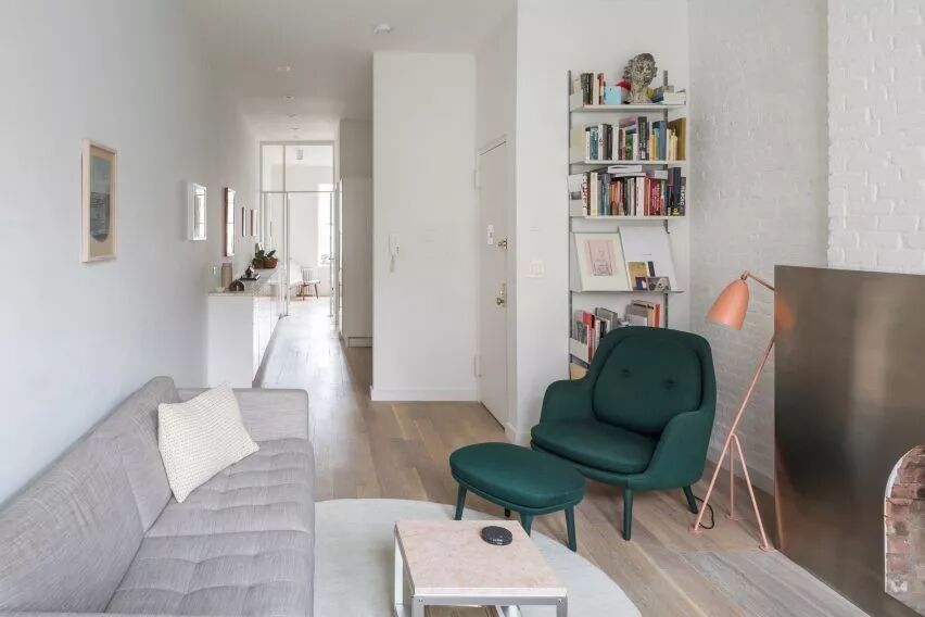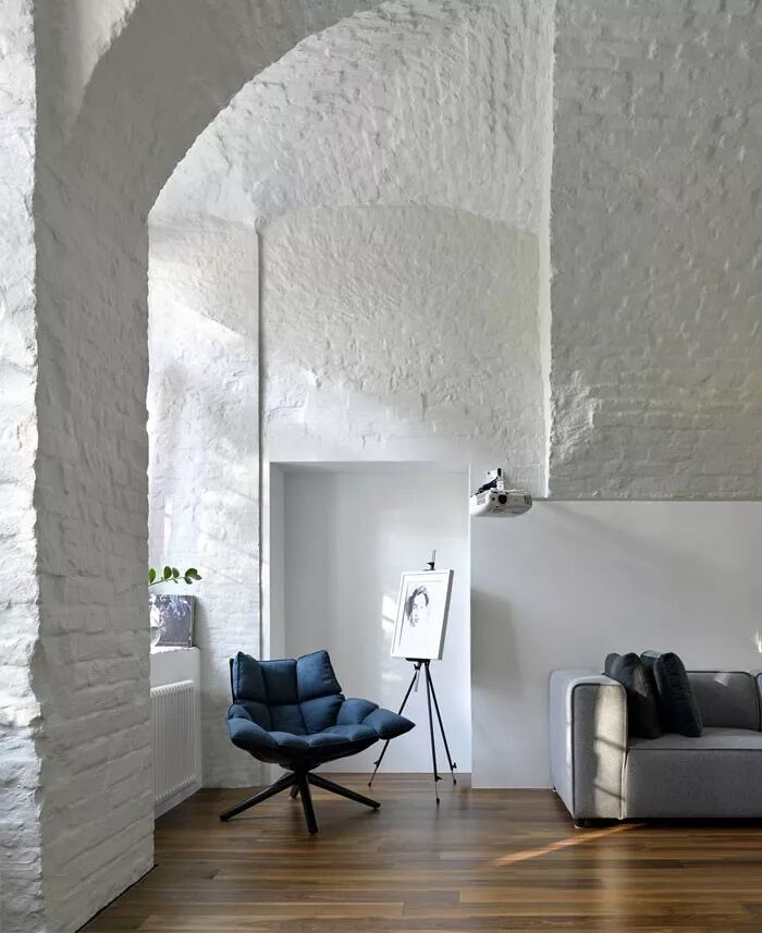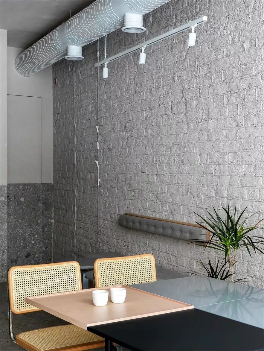 在室内置入一些明度较高的颜色,与纯粹的的白色“裸砖墙”撞色,可以是桌椅、摆件,也可以是墙体本身的涂料撞色。鲜艳色彩的注入能够丰富空间内容,于静谧里油然而生一种新鲜感。