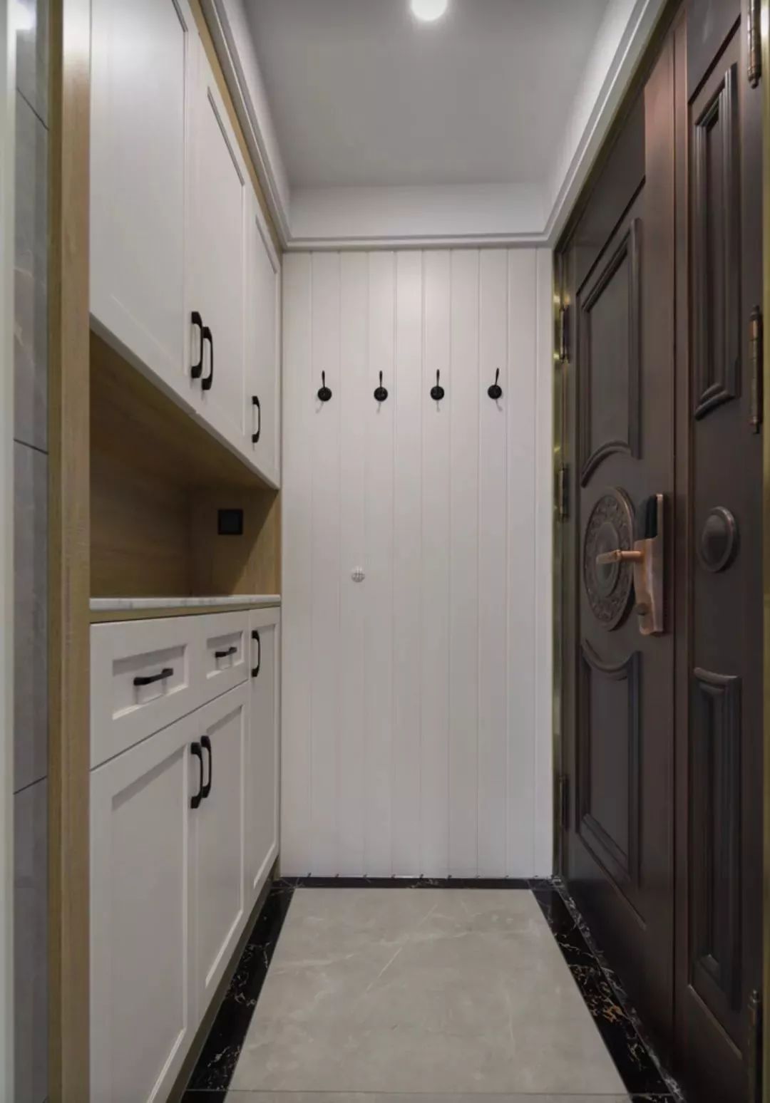 ▲玄关的墙面加入木色,让空间更加有质感。