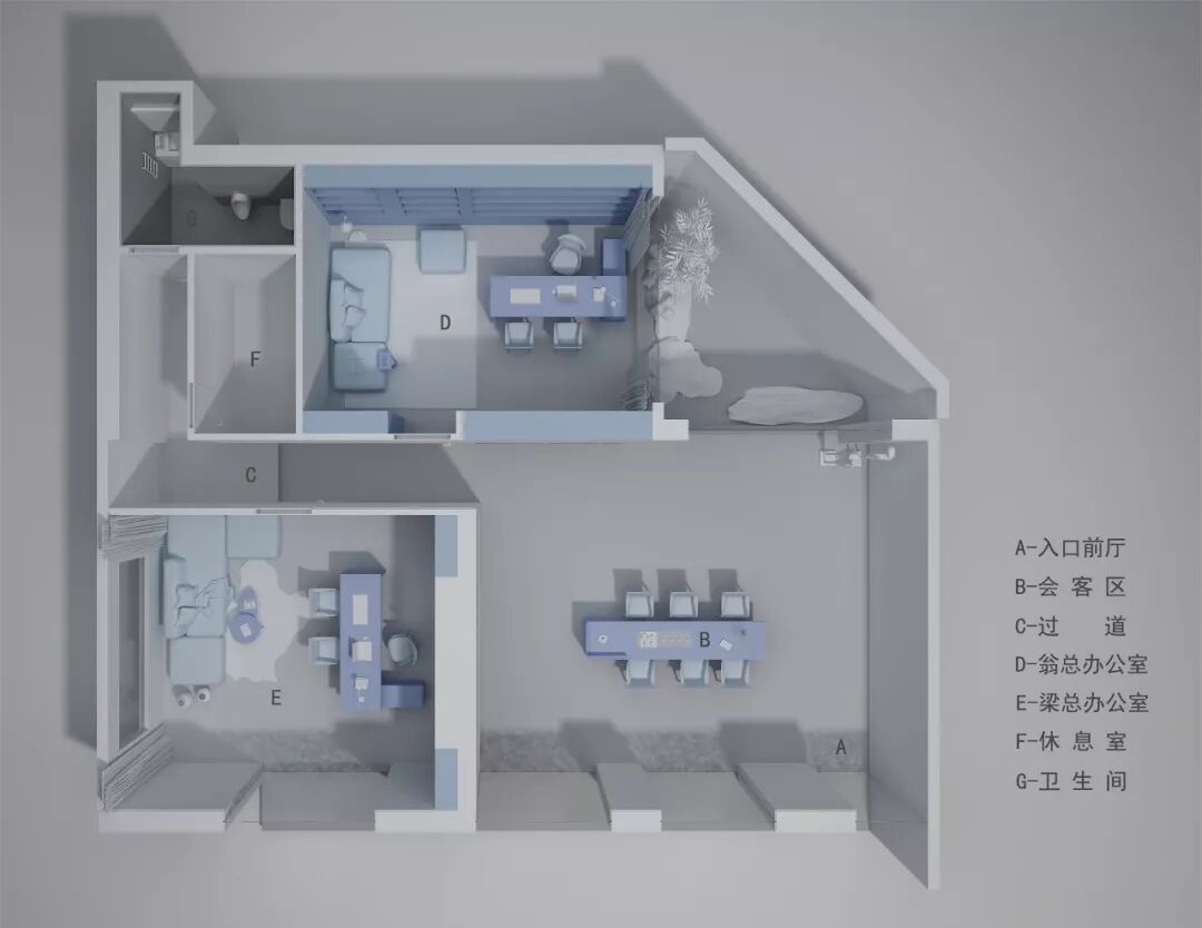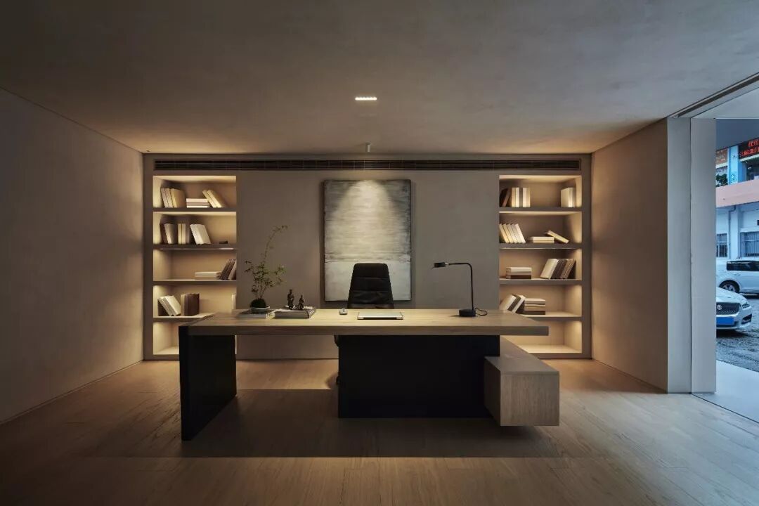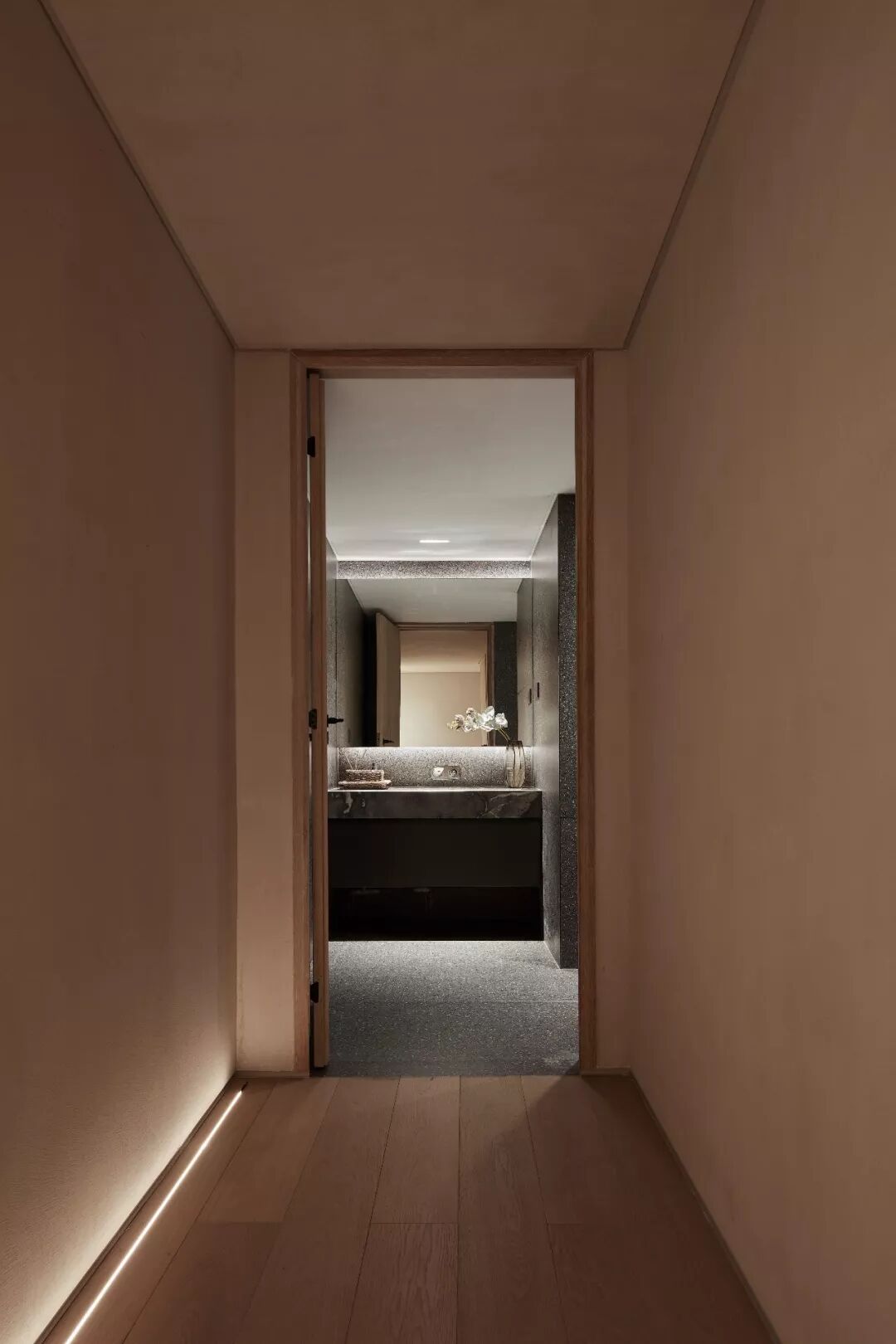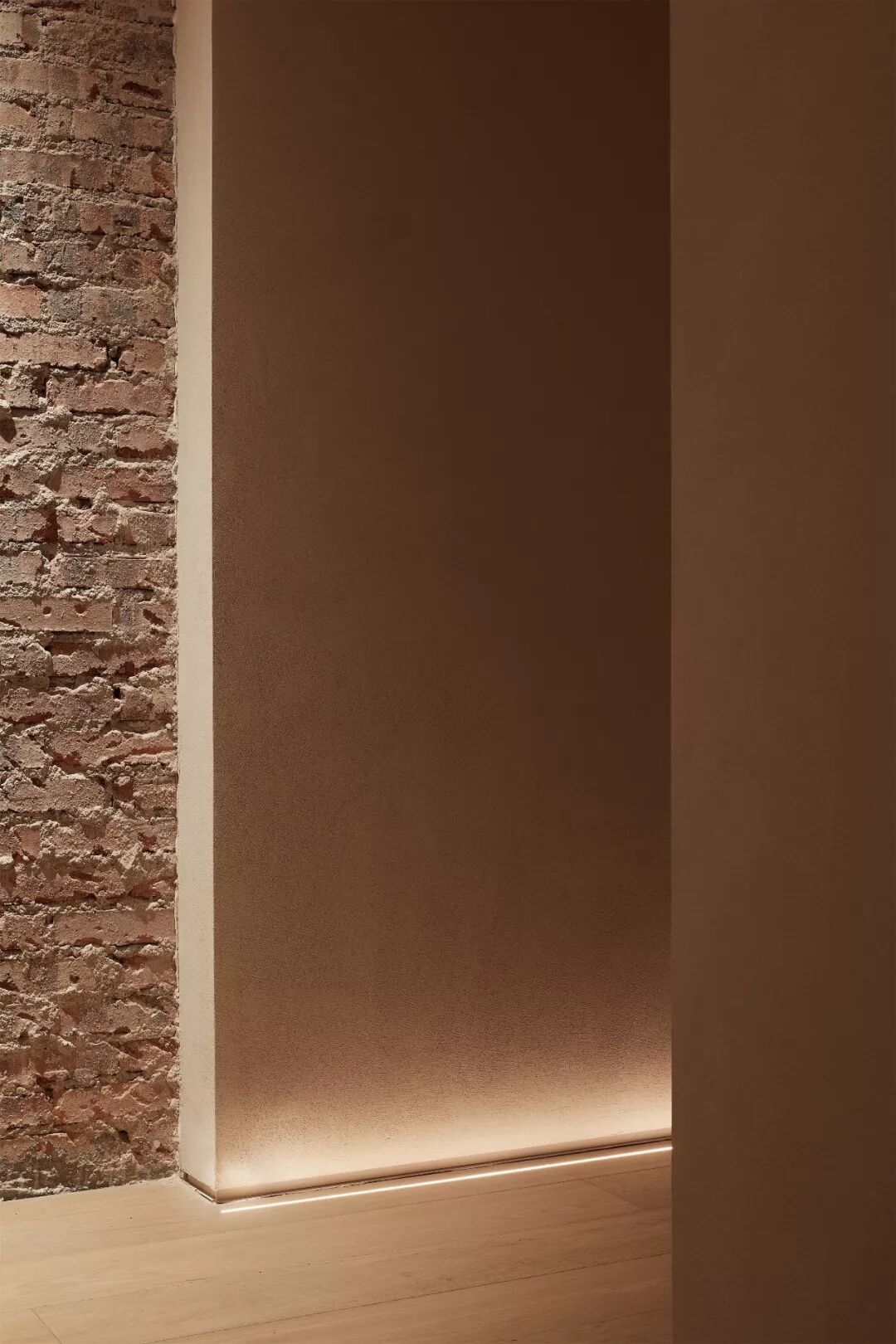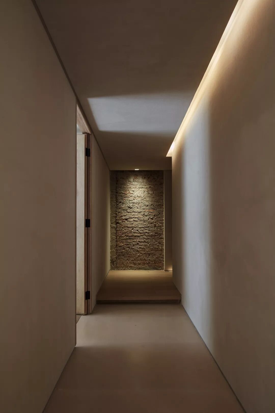 考虑到室内空间的实用性,该场所的功能简单说,只有办公和会客。公共部分用于与会客,交流学习,公司内部会议,公司内部培训等等。私人部分用于个人办公与休闲。我们的空间表达,可以概括为“用建筑的语言设计空间”和“明暗、线面对话”,进门大厅和走道就是最好的力证。仅靠单单入门的一条地面线光从室外穿透到室内,就能给人以犀利震撼的感受。这也表达出品界的极致利落的设计理念。过道上刻意留了一堵原始的毛胚墙,希望它保留原有状态。告诫自己,用当初的,最早的做设计的那种心态,坚持去面对当下,勿忘初心。