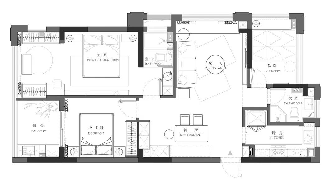餐厅与客厅之间没有鲜明的界限,而是将两者处于一个开放式的状态。一则为了节省小户型的面积,二则便于加强家庭成员间的交流,尤其是日常的亲子陪伴与互动。