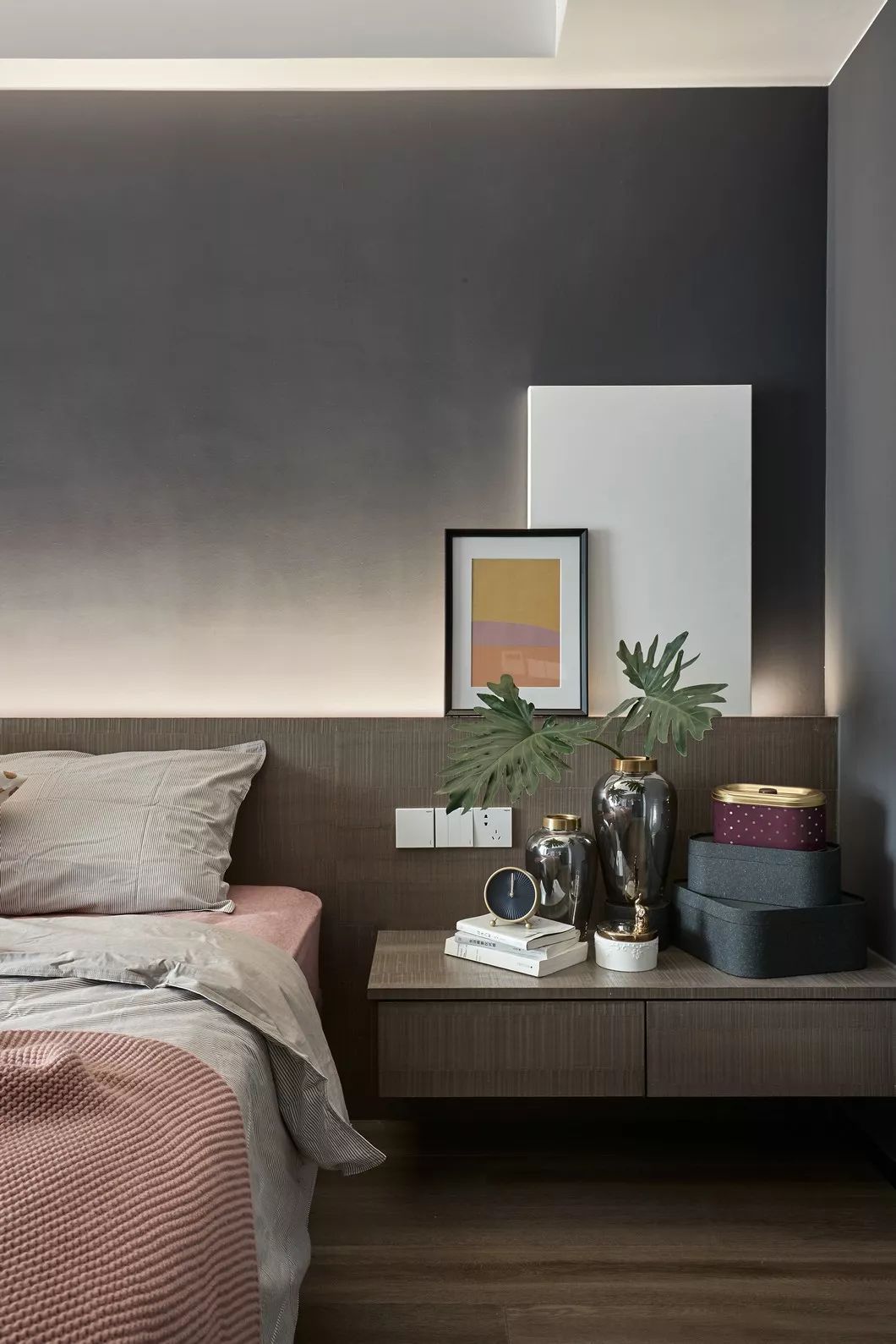 卧室在用色原则上与全屋保持一致,并通过充足的采光和洗墙灯提升亮度,达到了明亮、优雅的空间效果。