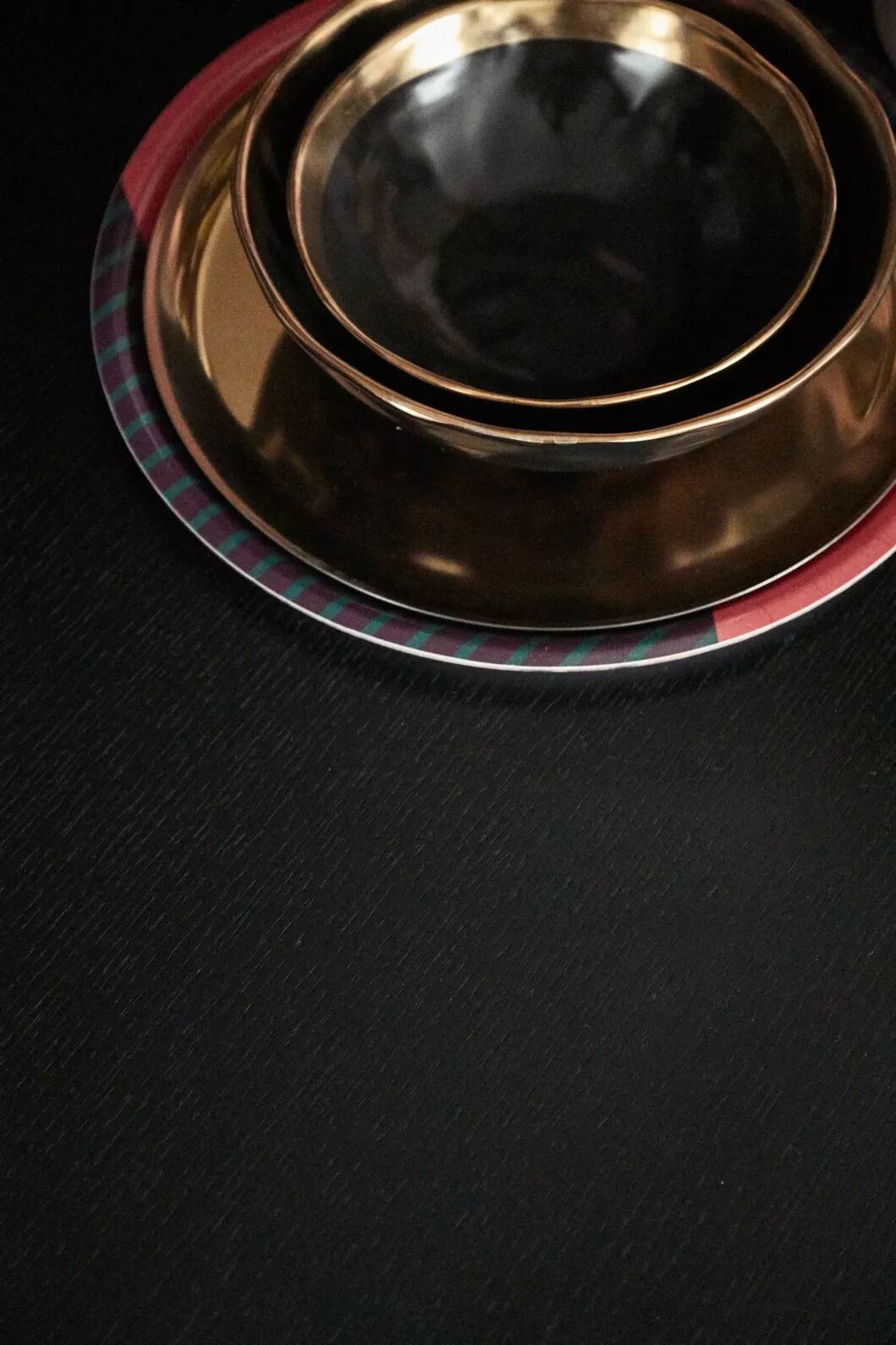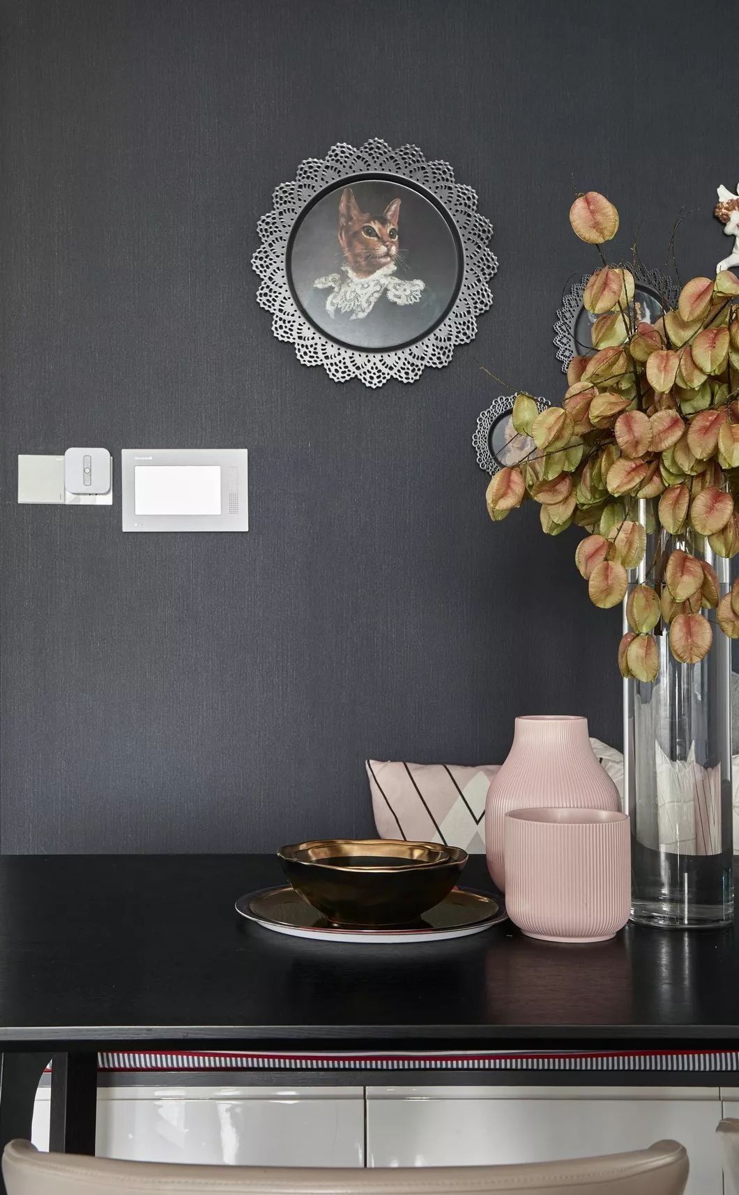 餐厅墙面装成灰色调的,给人以沉稳、静谧之感。然后搭配别致的复古挂盘去调和,餐桌上摆放精致的花束与餐具,令画面看起来更有层次感。