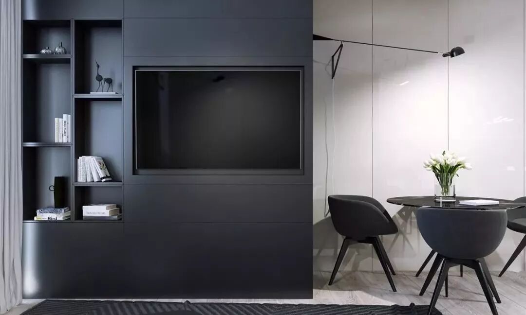电视机挂墙上不仅更安全,颜值高,还可以省出电视柜的空间。或者直接做整墙收纳,中间留空把电视挂上去~