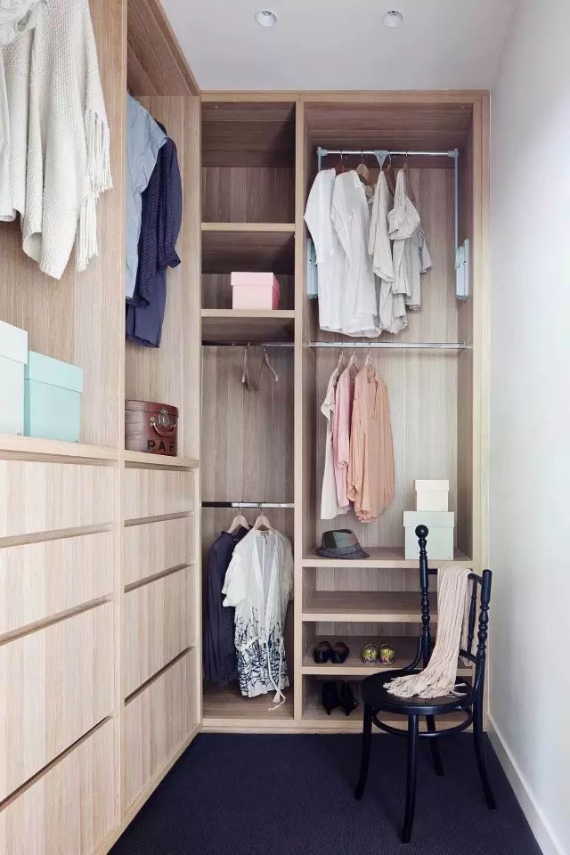 无法设置独立的衣帽间,这个时候可以利用转角这个被大家认为空间死角的位置,利用两处相连的墙面,用衣柜拼接设计,让转角区域成为一个衣帽间,不仅节省了空间,也很美观。