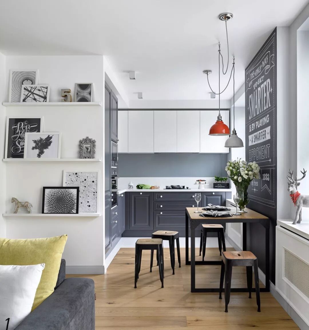 小空间的开放式厨房为了优化空间,也可以利用这个岛屿,简单的添加一些凳子,瞬间变成一个温馨的餐桌。
