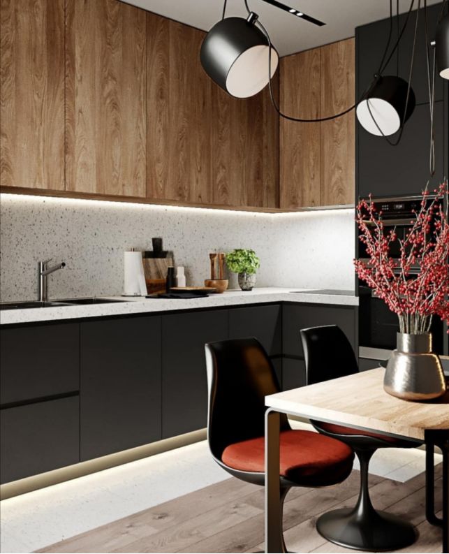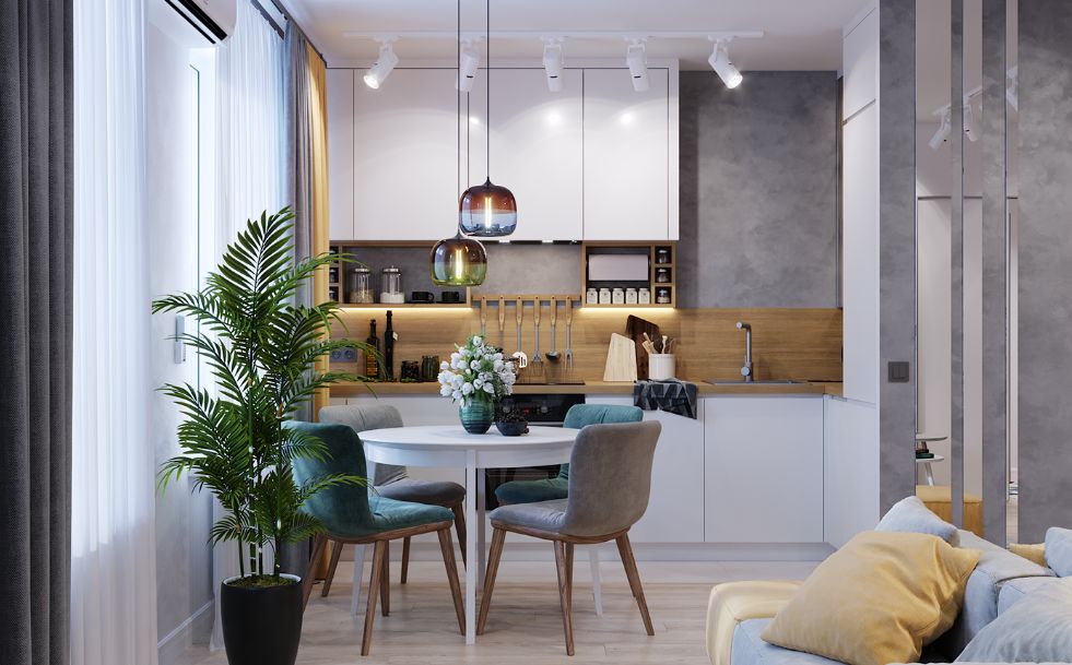利用餐桌或操作台来分割烹饪与客厅生活之间的区域。两个区域之间可以选择对比性强的元素能让空间看起来更大。