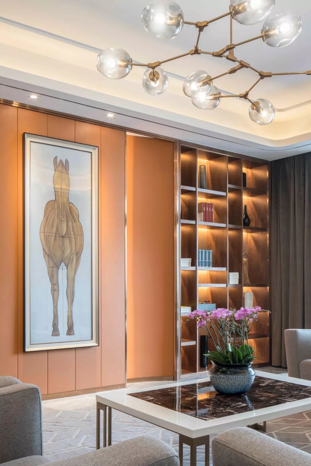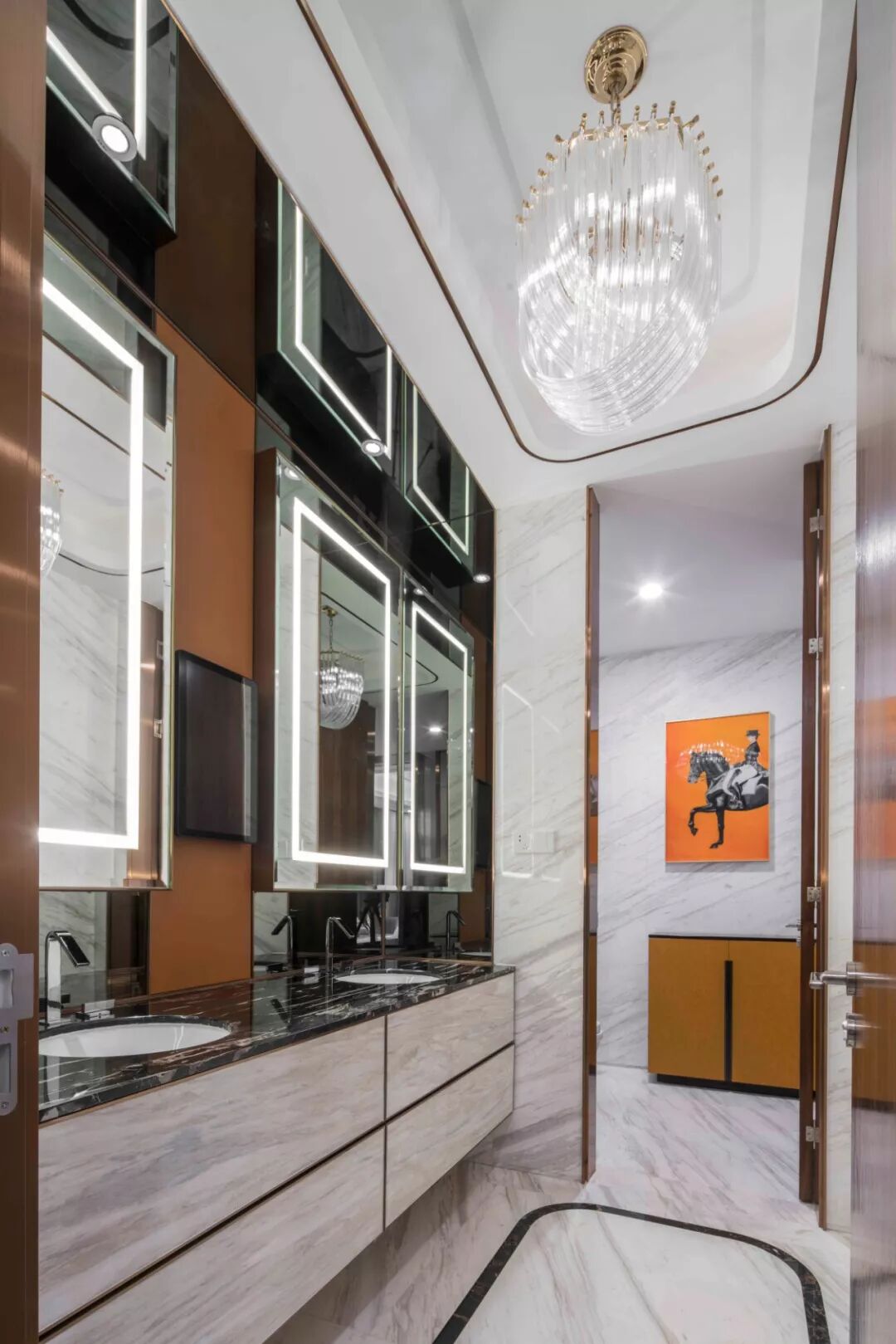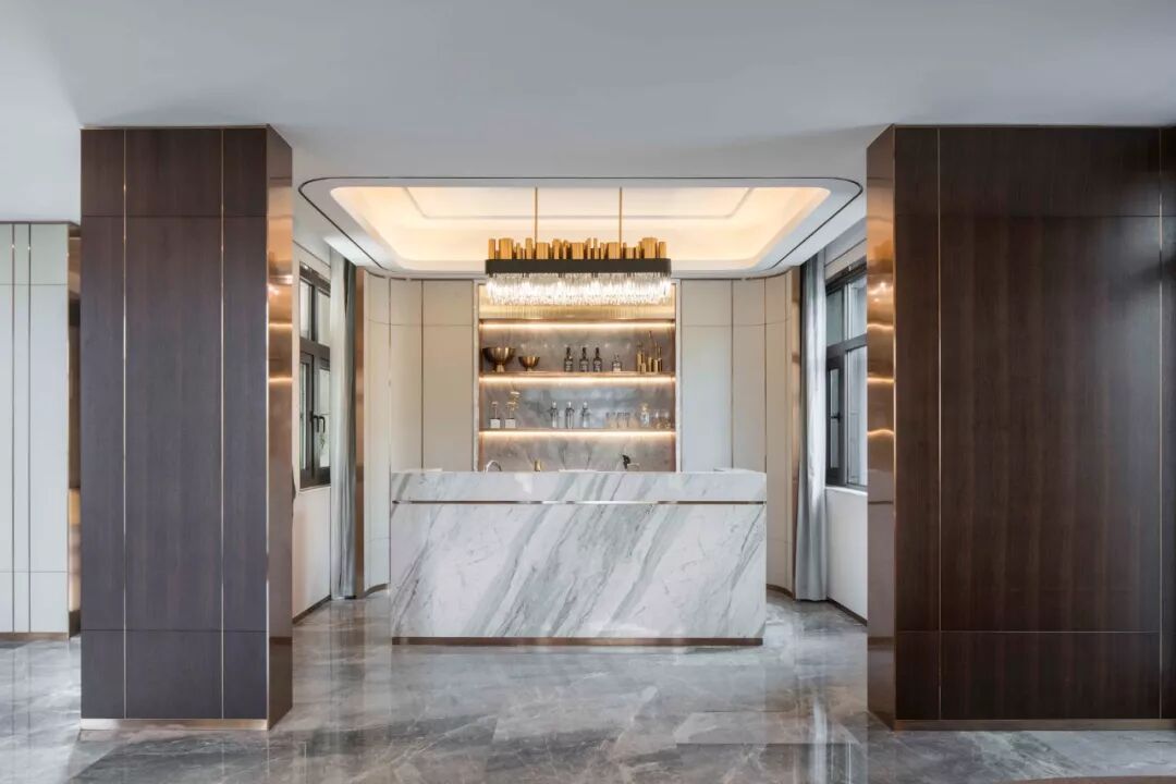 步入前厅,素简琉璃的水晶灯饰错落交叠,轻盈梦幻,温润了大理石的冰冷。纤细刚毅的线条,勾勒出空间莹白优雅的气质,如晴日里的微波粼粼江面,如柔和的星体交织出的浪漫星河。既宁静,又灵动。