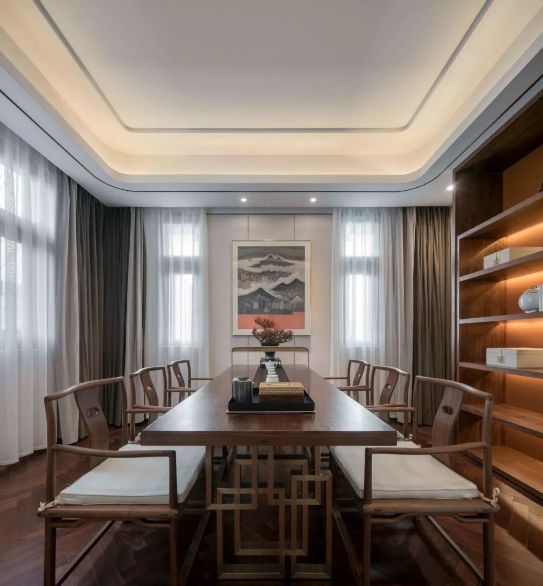 茶室中写意泼墨画与整体基调相映成趣,整体不显沉闷而富有质感,以悠然生活“品质”之名,表达着空间的自我品味。