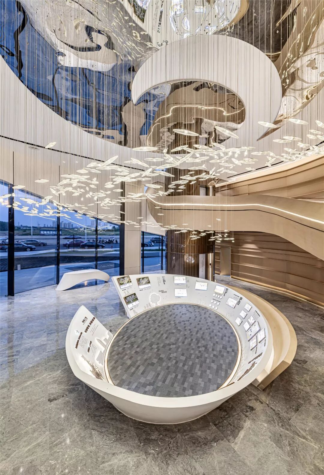 在建筑物的前后两侧规划了大面积的绿化景观带以构筑幽静清新的自然空间环境。以合肥母亲河”淝河水形”为设计灵感,沿用淝河曲线的艺术设计概念,运用几何艺术元素引入到室内空间中,通过几何艺术元素结合室内功能,进行有机的结合,创造一个有序、人文、艺术、富有美学构成的空间。