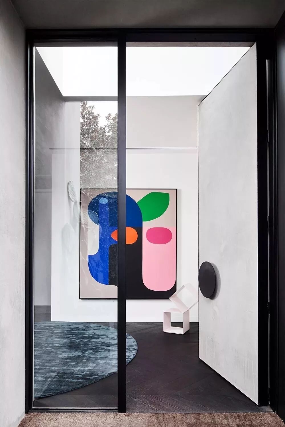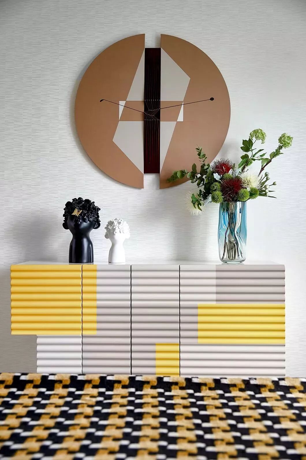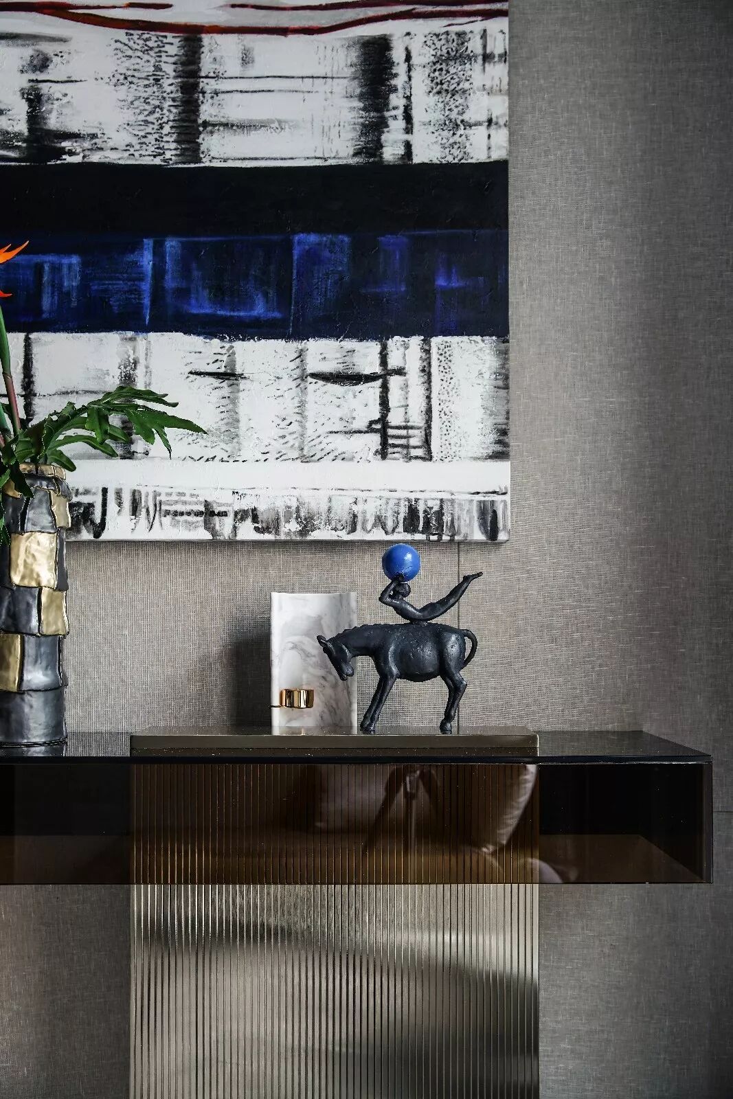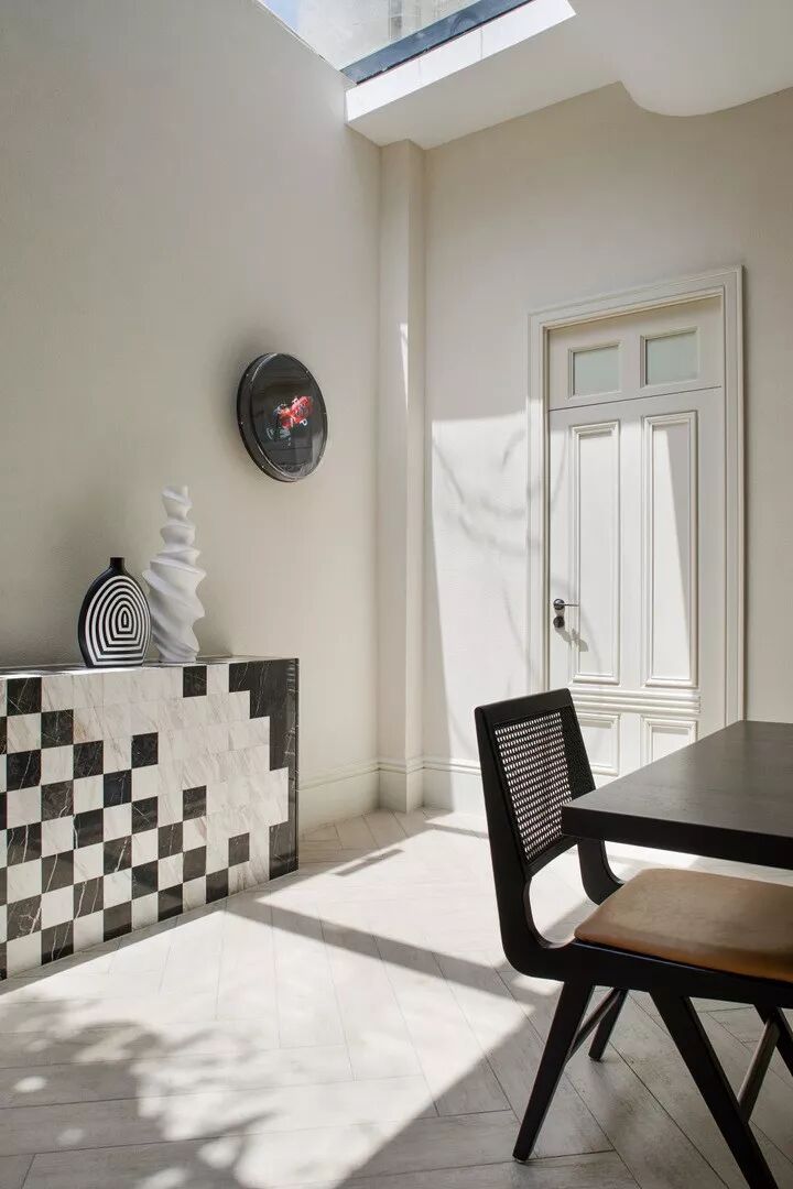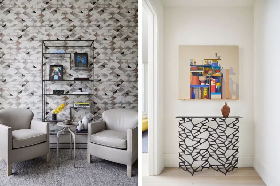 端景墙的设计主要有两种方向:一是墙体本身的解构,比如色彩对比强烈的的墙绘、挂画,或者将墙面凿出凹陷的空间,将“景”巧妙的嵌入墙内,美观吸睛又无功能性负担;二是靠墙摆放装饰器具,如展架、端景台、有设计感的家具等,实用性更强。也可将两种方式相结合,相得益彰,形成更丰富的景观层次。