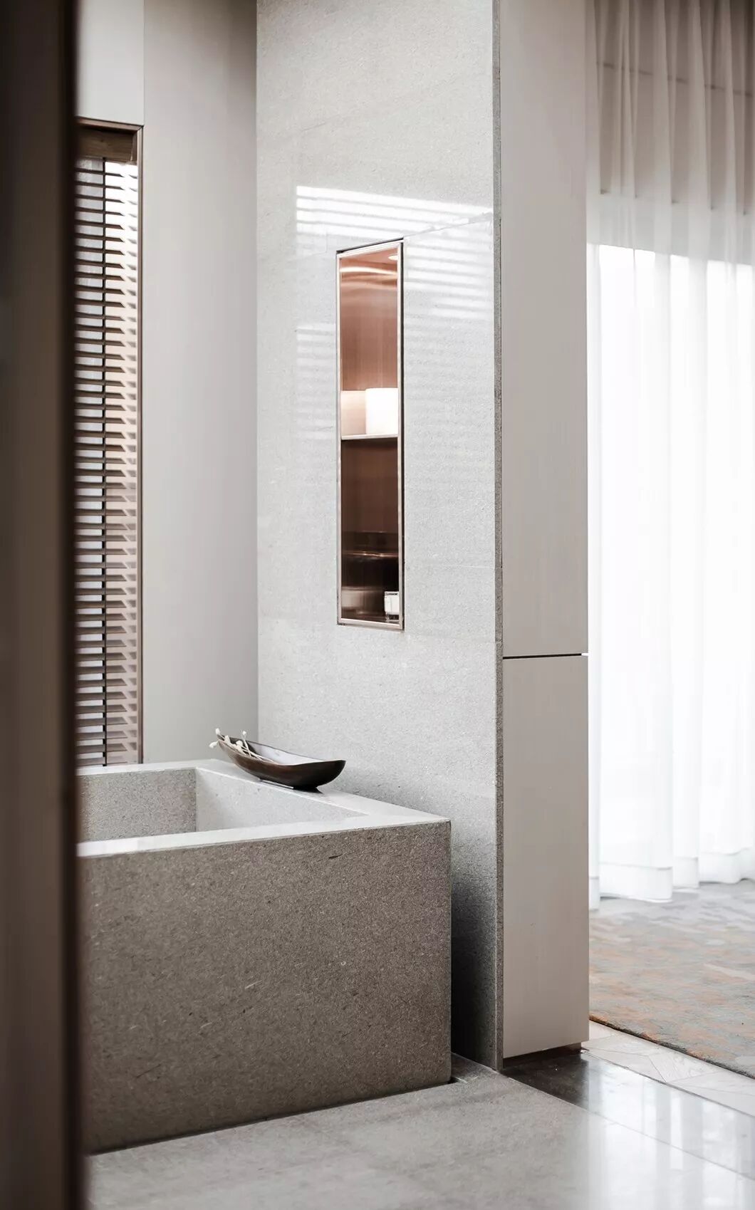卫生间位于卧室的左侧,浴缸被单独分离设于卧室右侧,点上一支香薰,手捧一本书,主人可以独享沐浴放松时光。