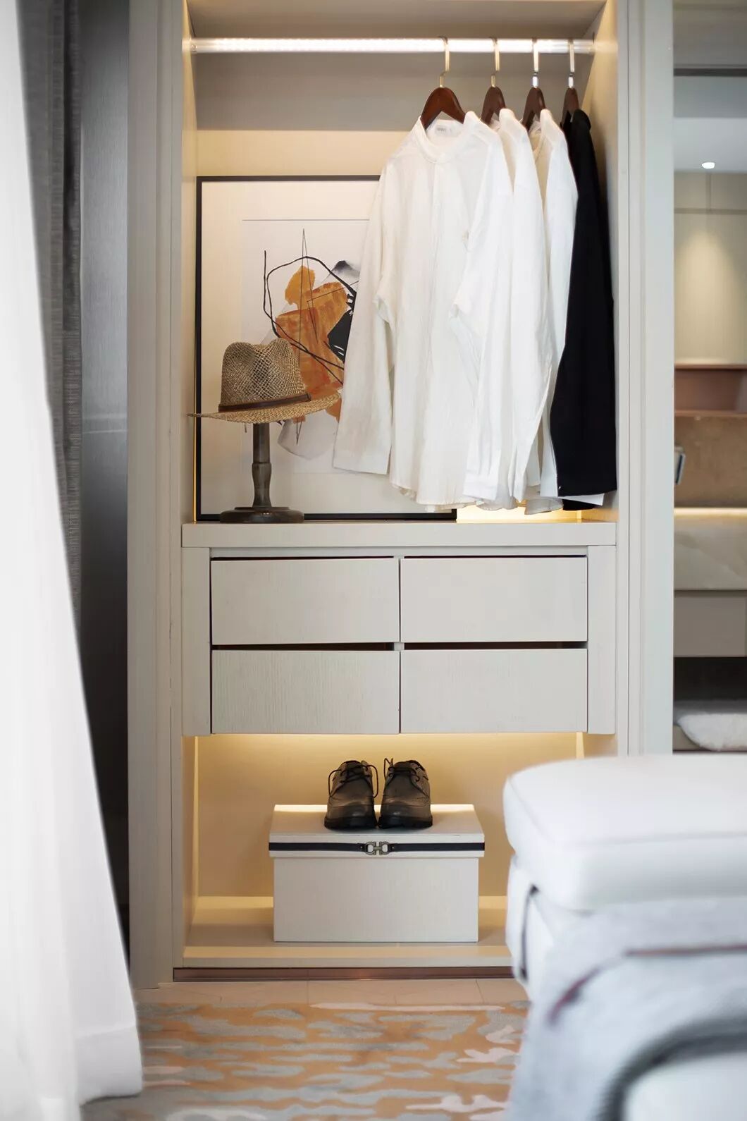 白色为主调,温和的木色为空间底妆,结合木材的自然纹理,让四周兼顾美观舒适的同时,植入安静纯粹的精神观感。