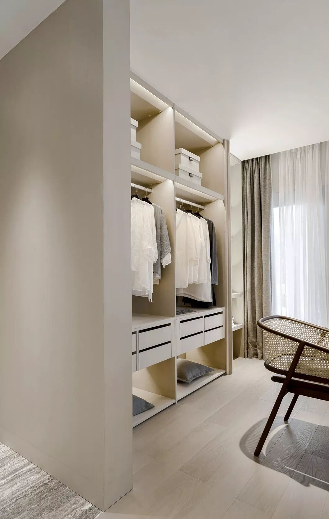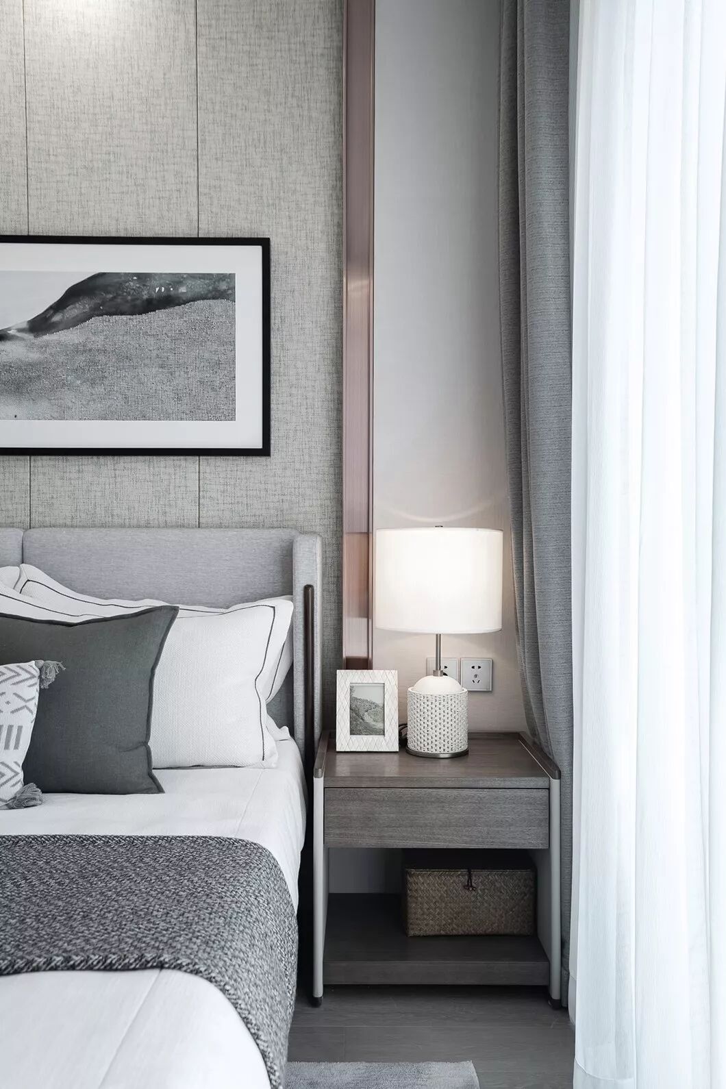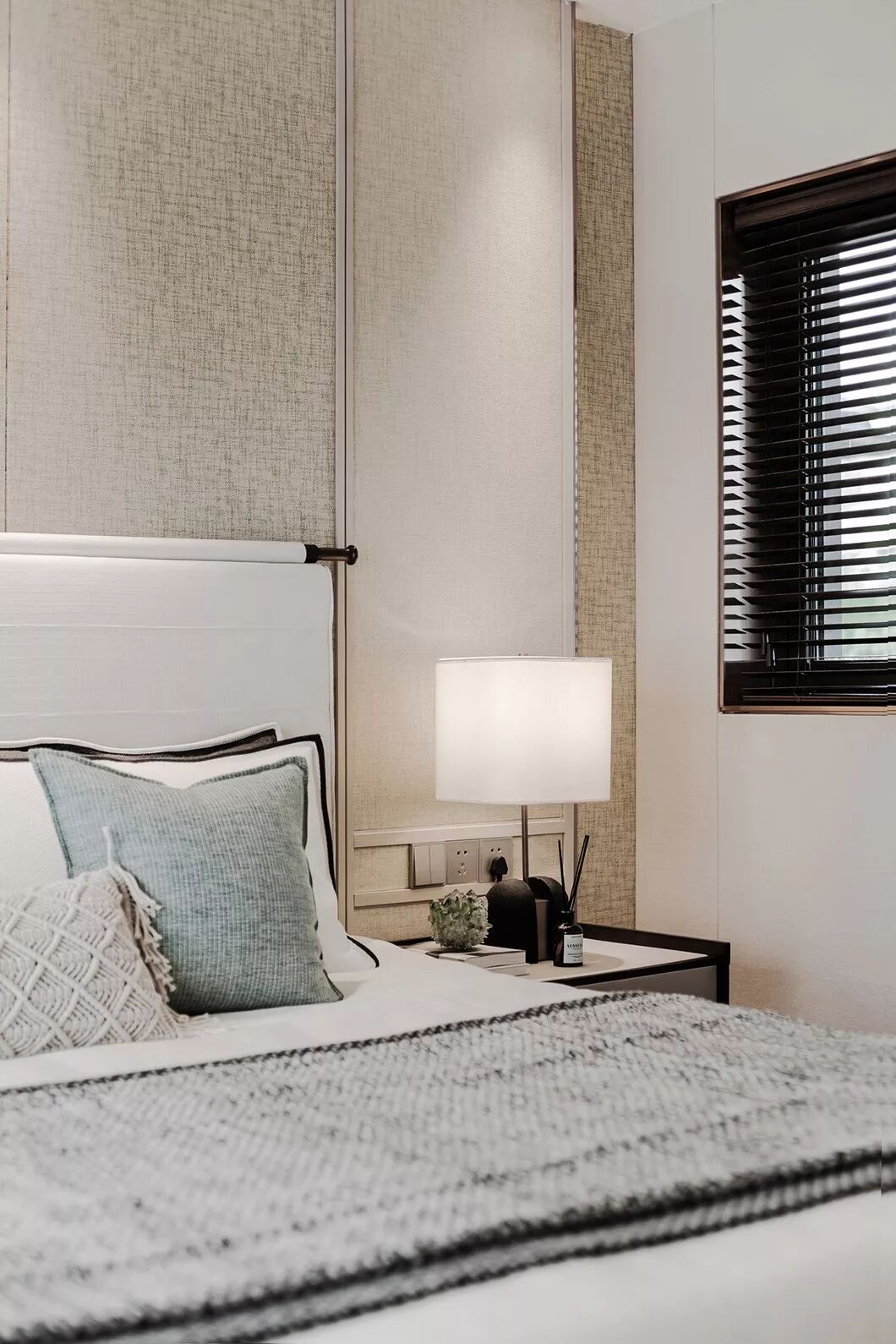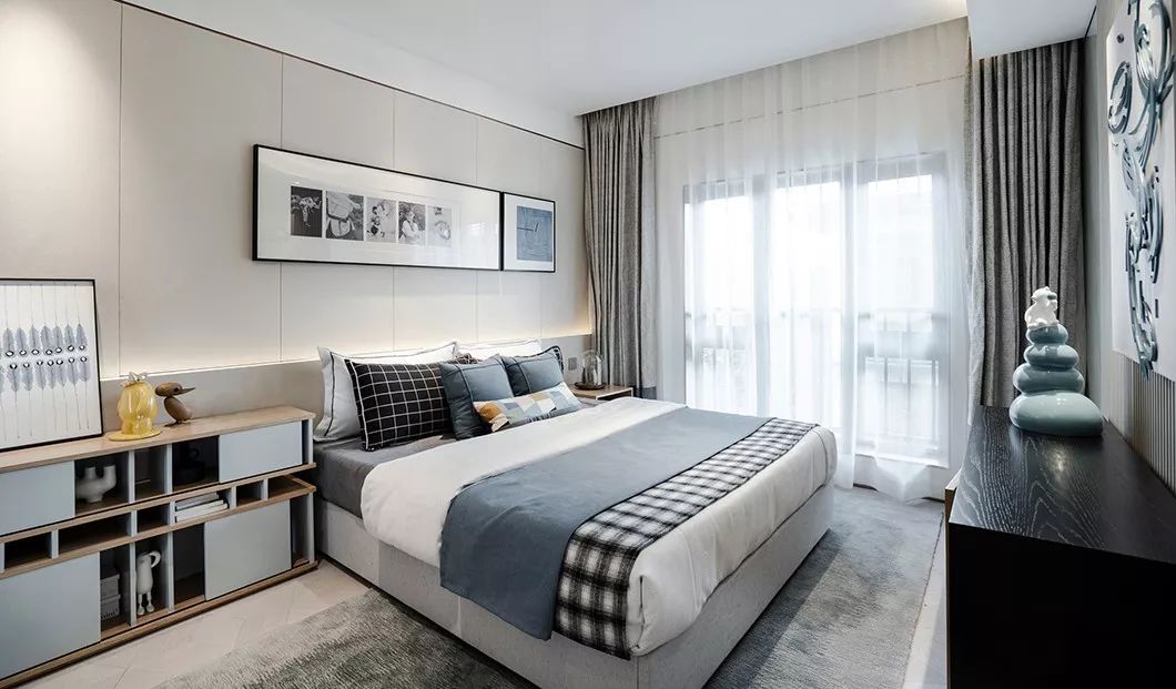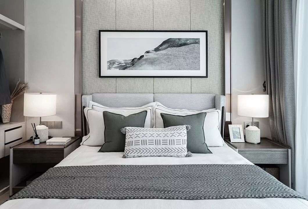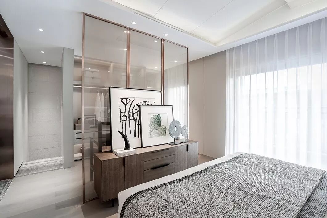 卧室的软装材料,以有质感的棉麻搭配带有暗纹的窗帘,家具主要以浅木饰面为主,局部使用拉丝古铜、皮革、大理石做点缀,雅致风情之韵让人沉醉其中……