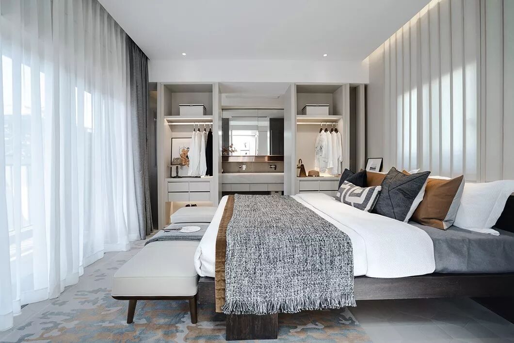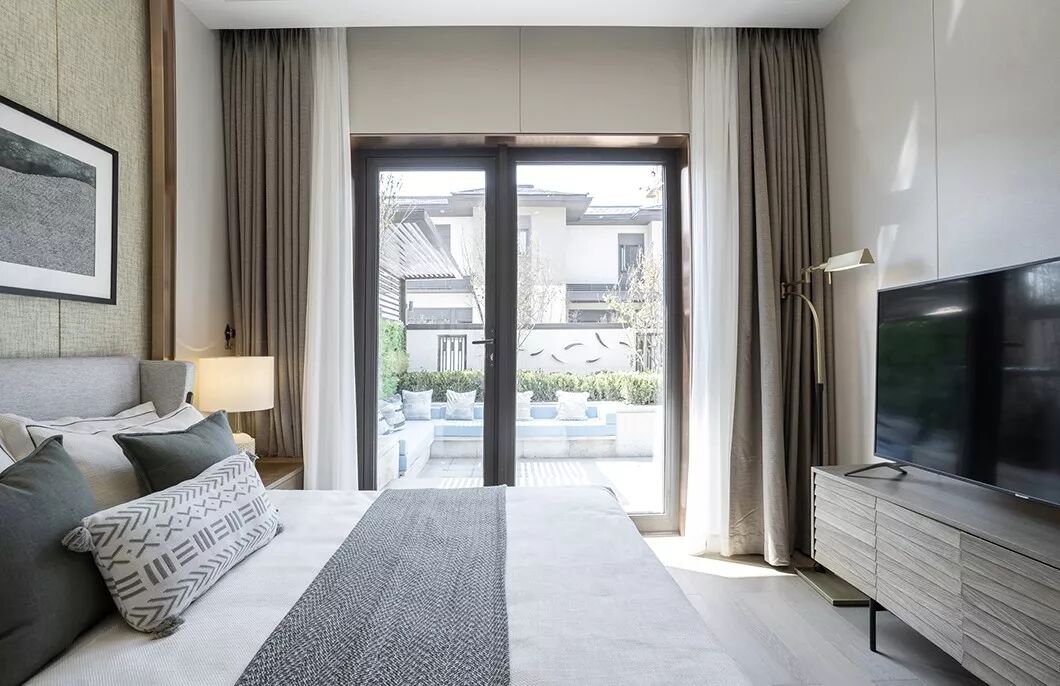 卧室以开放式布局重新调整功能分区,床头背景是一扇可开合的推拉窗,正对面是露台,室内明亮通透。