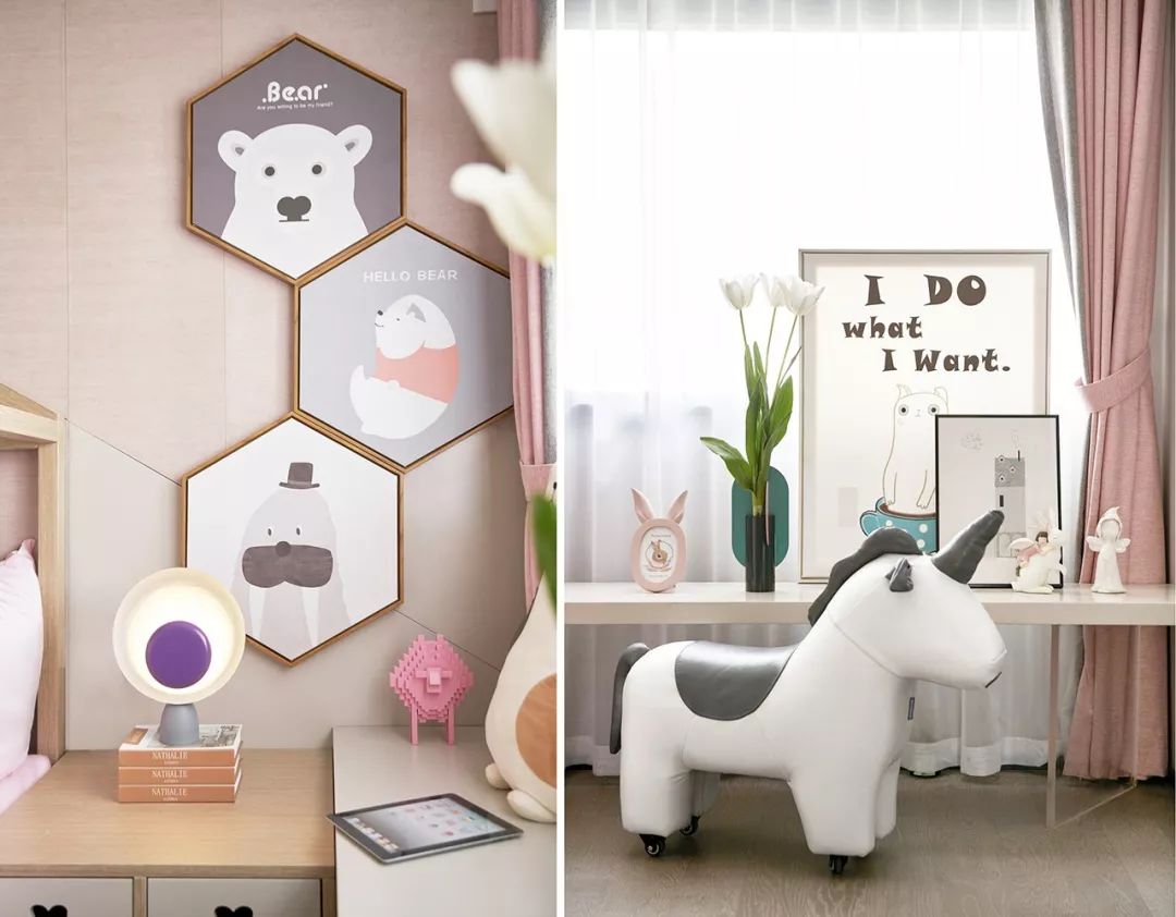 儿童房是一方梦幻的小天地。柔和的色调似真似幻,让人不自觉的放轻脚步。可爱的独角兽,童话精灵摆件,纯洁的花艺,是小主人美好的梦中场景。