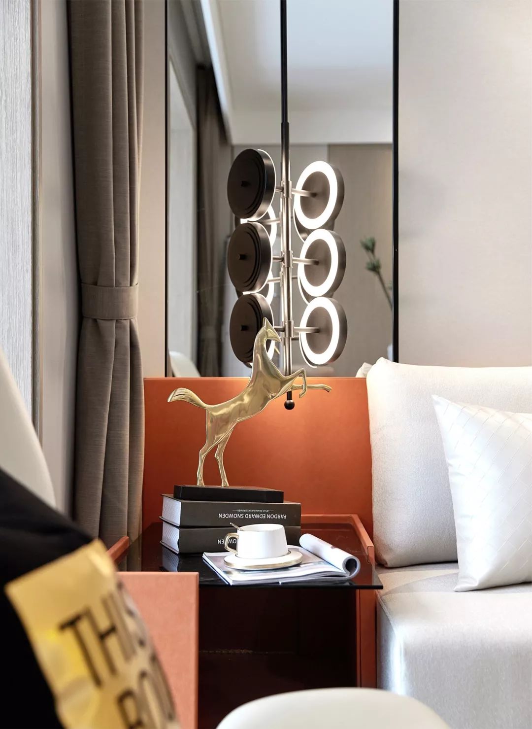 客厅以浅木色和大面的米白为主色调,诠释温馨明亮的气质,家具中跳脱的橙与纯粹的黑白形成碰撞对比,尽显生机与活力。透过薄纱引入天光,在和煦的阳光下满是温馨与浪漫。