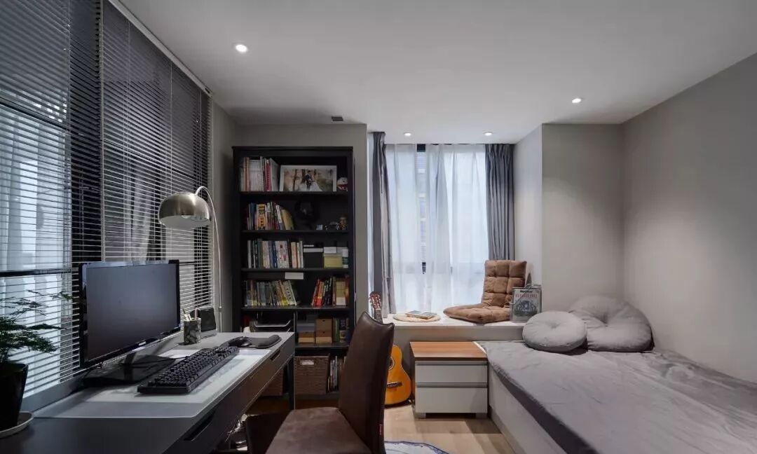 ▲ 书房整个空间延续灰色调性,榻榻米床架与飘窗,成品书桌书柜,多功能空间可随时变客卧