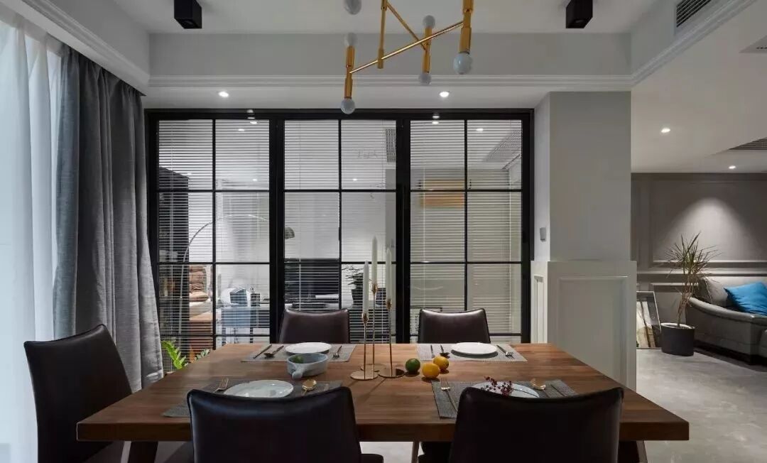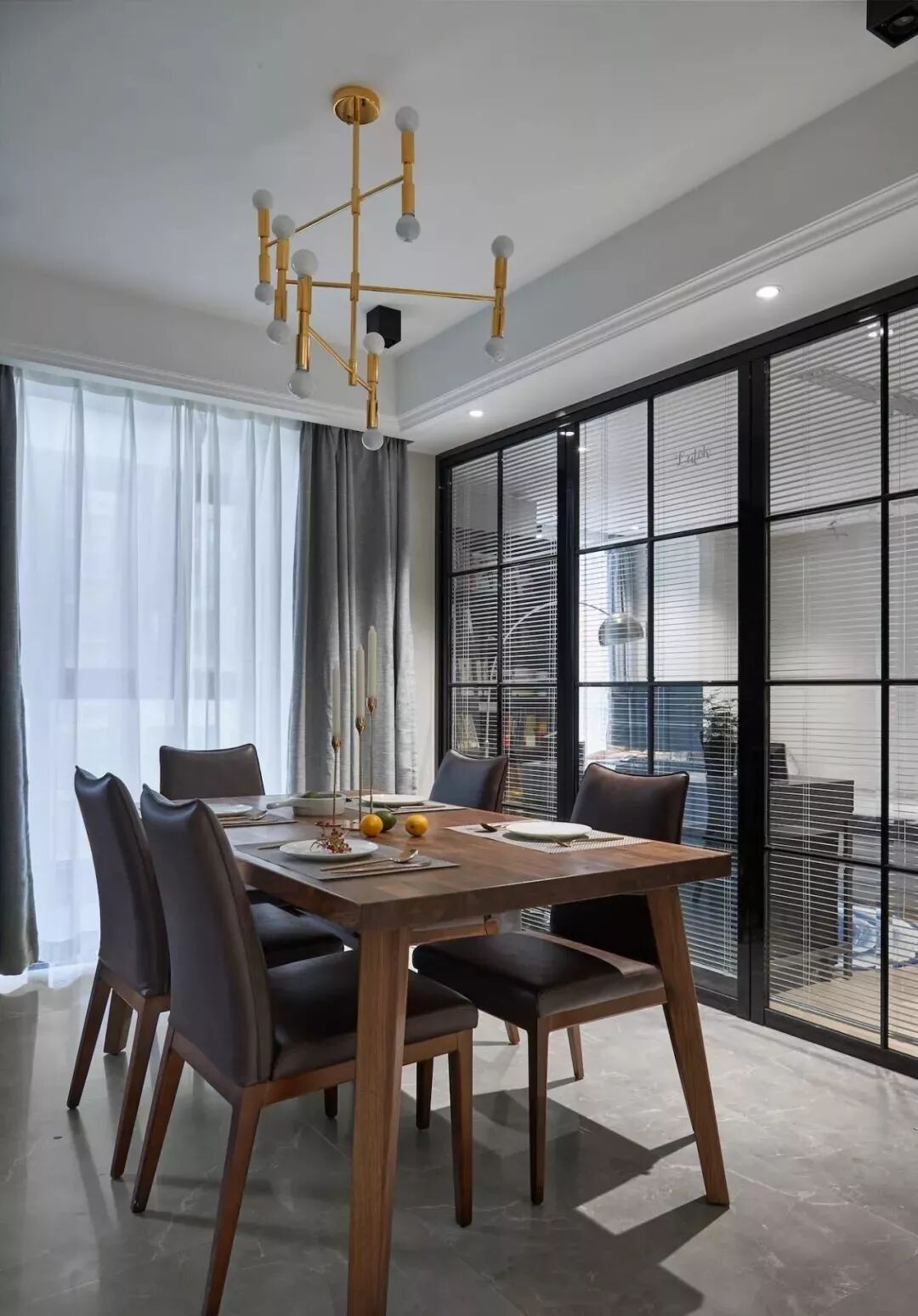 ▲ 餐厅与书房之间通过黑色玻璃隔墙作分割,加上百叶帘
