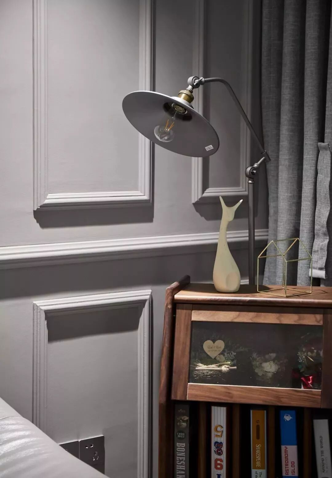 ▲ 沙发一旁的实木边柜造型别致,收纳主人藏书,复古落地灯与空间主色调保持一致